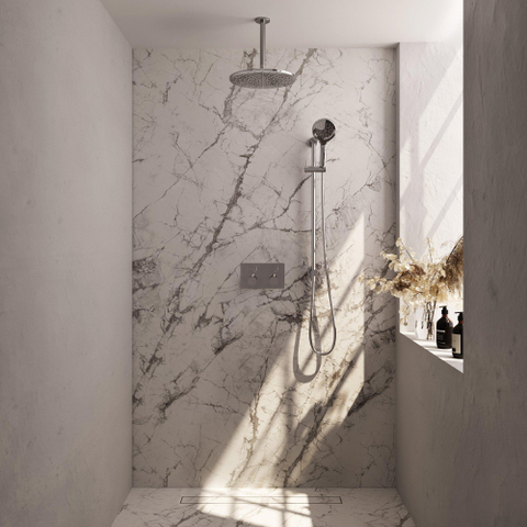 - De doucheset wordt geleverd inclusief een 30 cm chromen hoofddouche, een plafondarm, een 3 standen handdouche, een doucheslang en een geïntegreerde glijstang.