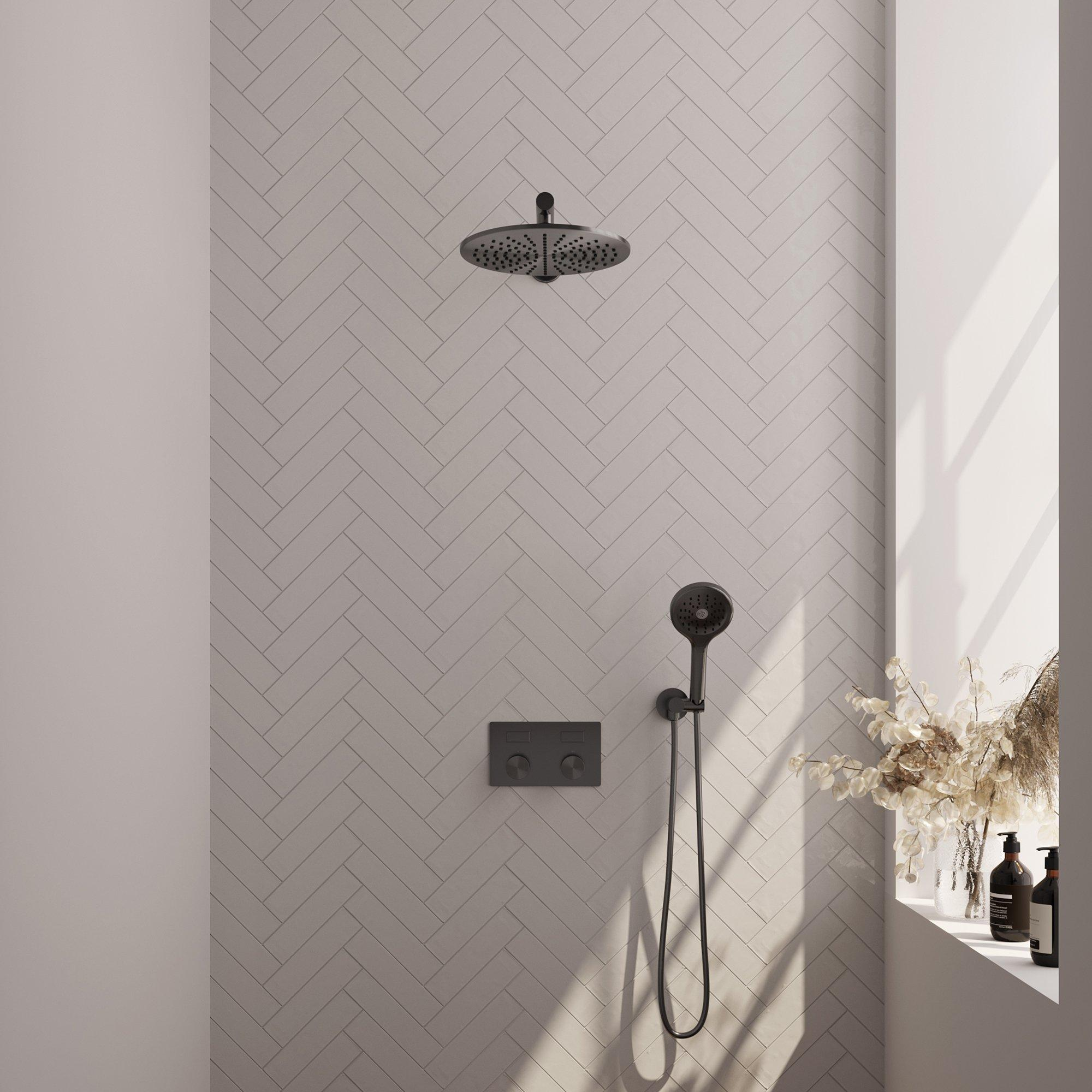 De BRAUER gunmetal Carving Thermostatische Regendouche inbouw straalt een moderne uitstraling uit dankzij zijn strakke lijnen en gunmetal geborsteld PVD afwerking. Deze eigentijdse douche past perfect in een eigentijdse badkamer en voegt een vleugje elegantie toe aan de ruimte. De drukknoppen zorgen voor een intuïtieve bediening, terwijl de 30cm hoofddouche een luxueuze regenval biedt voor een verkwikkende douche-ervaring.