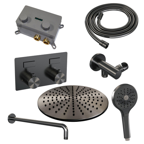 BRAUER gunmetal Edition Thermostatische Regendouche inbouw - drukknoppen - SET 58 - 30cm hoofddouche - gebogen muurarm - 3 standen handdouche - doucheslang - wandaansluitbocht - gunmetal geborsteld PVD