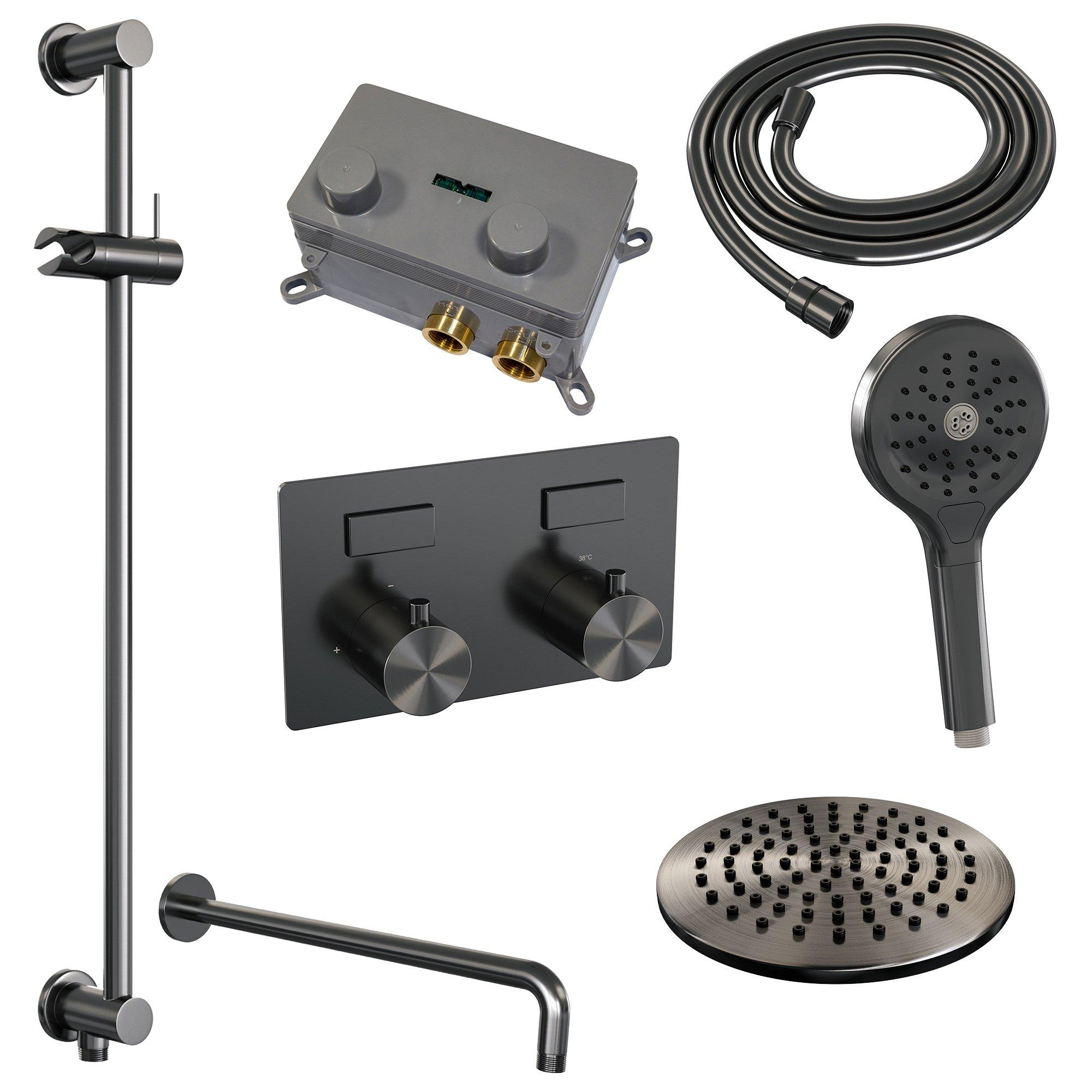 BRAUER gunmetal Edition Thermostatische Regendouche inbouw - drukknoppen - SET 69 - 20cm hoofddouche - gebogen muurarm - 3 standen handdouche - doucheslang - geïntegreerde glijstang - gunmetal geborsteld PVD