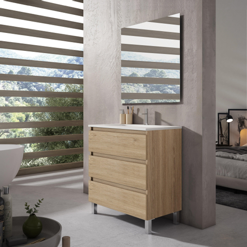 Saniclass Chaci PLUS Badkamermeubelset - 80x86x46cm - keramische wastafel wit - 1 wasbak - 1 kraangat - 3 lades - rechthoekige spiegel - eiken