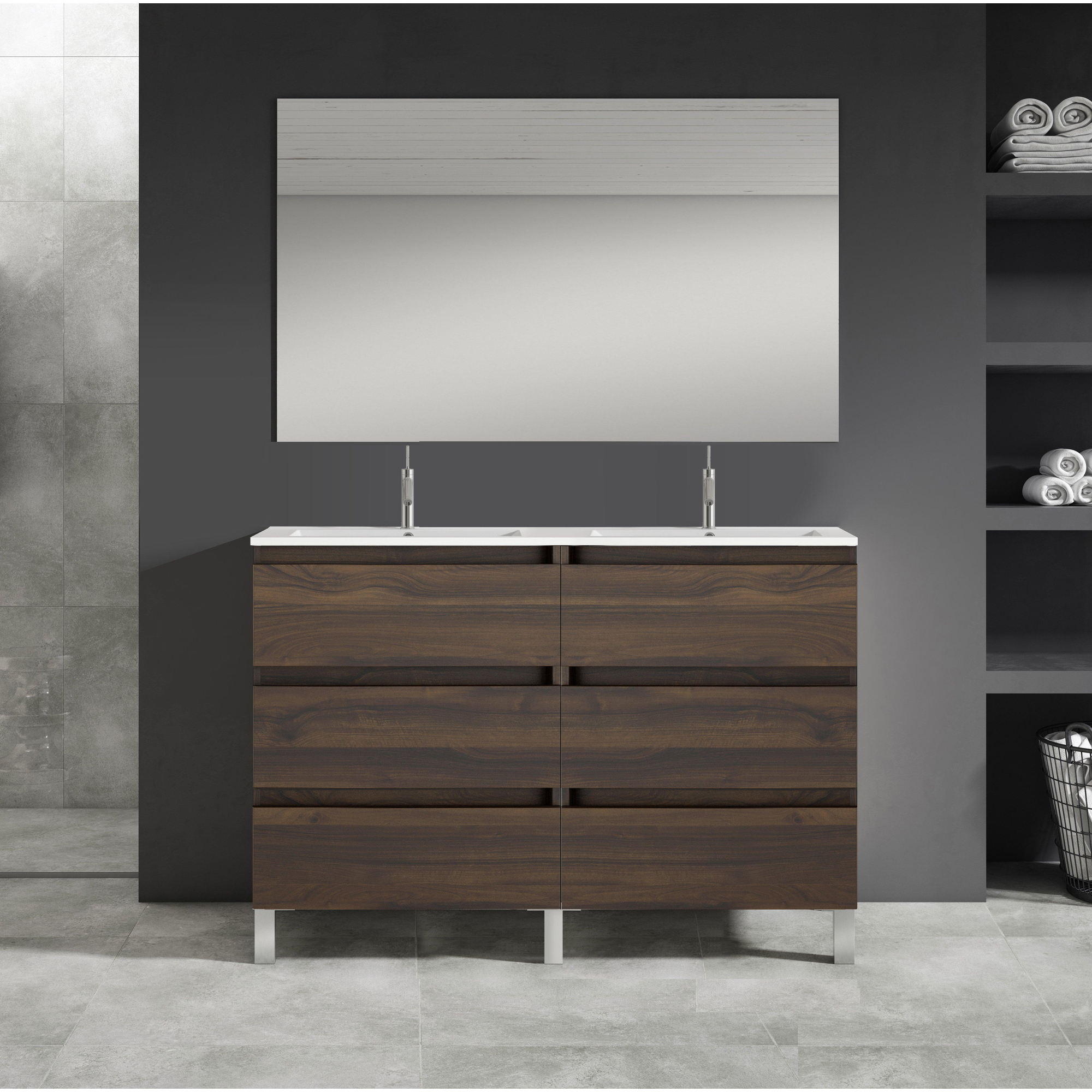 Saniclass Chaci PLUS Badkamermeubelset - 120x86x46cm - keramische wastafel wit - 2 wasbakken - 2 kraangaten - 6 lades - rechthoekige spiegel - noten (hout)