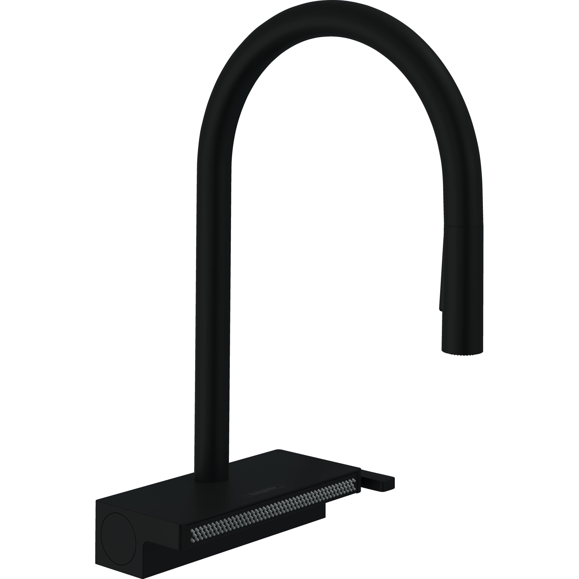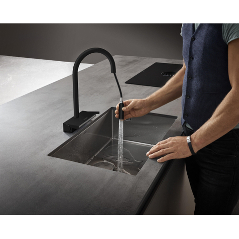 De kraan is uitgerust met een innovatieve sBox die de uittrekbare handdouche soepel en netjes opbergt. Met drie verschillende straalsoorten – een zijdezachte douchestraal, een kristalheldere laminaire straal en een krachtige douchestraal – kies je altijd de perfecte waterstraal voor jouw klus. De magnetische houder (MagFit) zorgt ervoor dat de handdouche stevig op zijn plek blijft, terwijl je met één druk op de knop eenvoudig wisselt tussen de standen. De kraan is bovendien draaibaar in vier verschillende hoeken, zodat je altijd de ideale positie vindt. Dit alles maakt het werken in de keuken efficiënter en aangenamer.