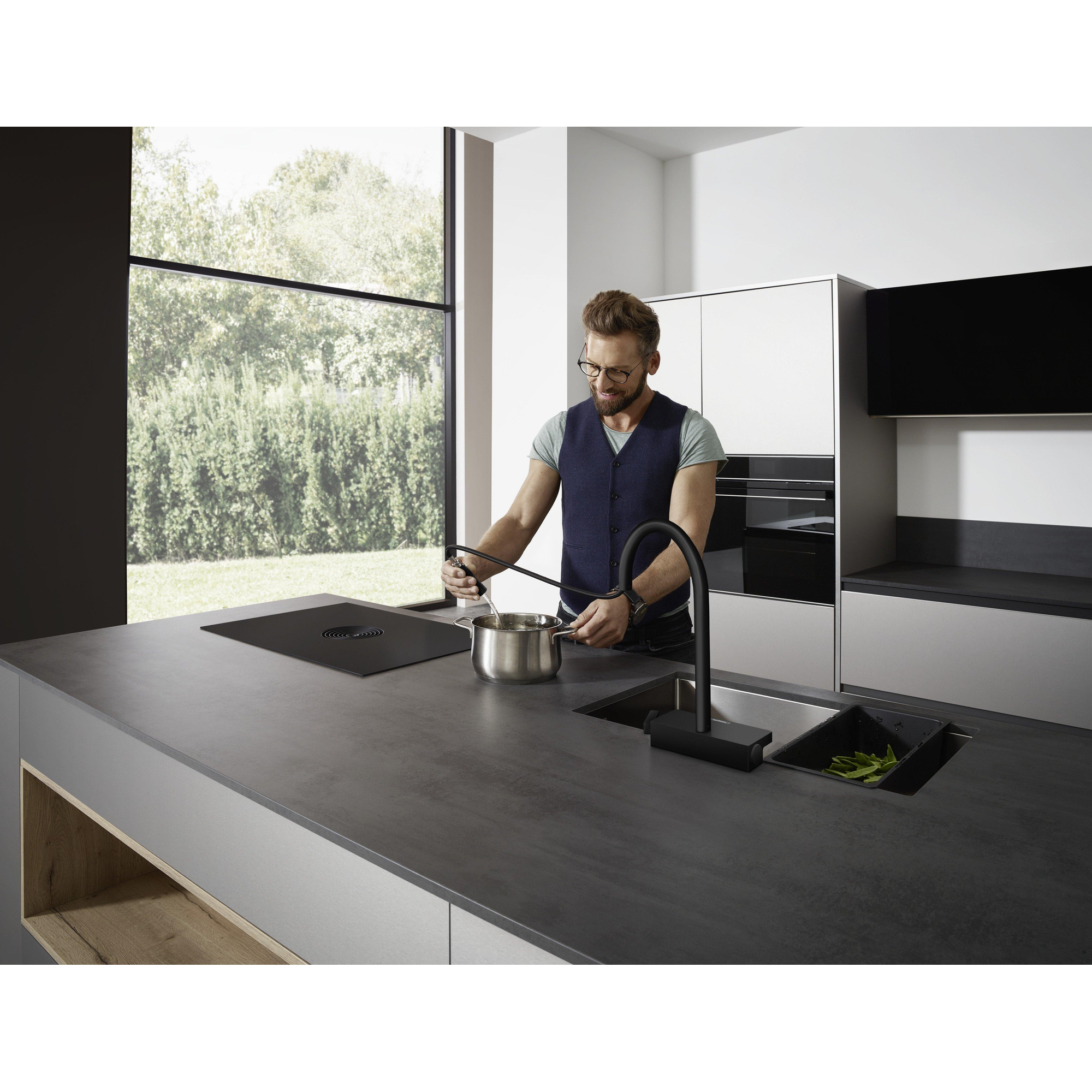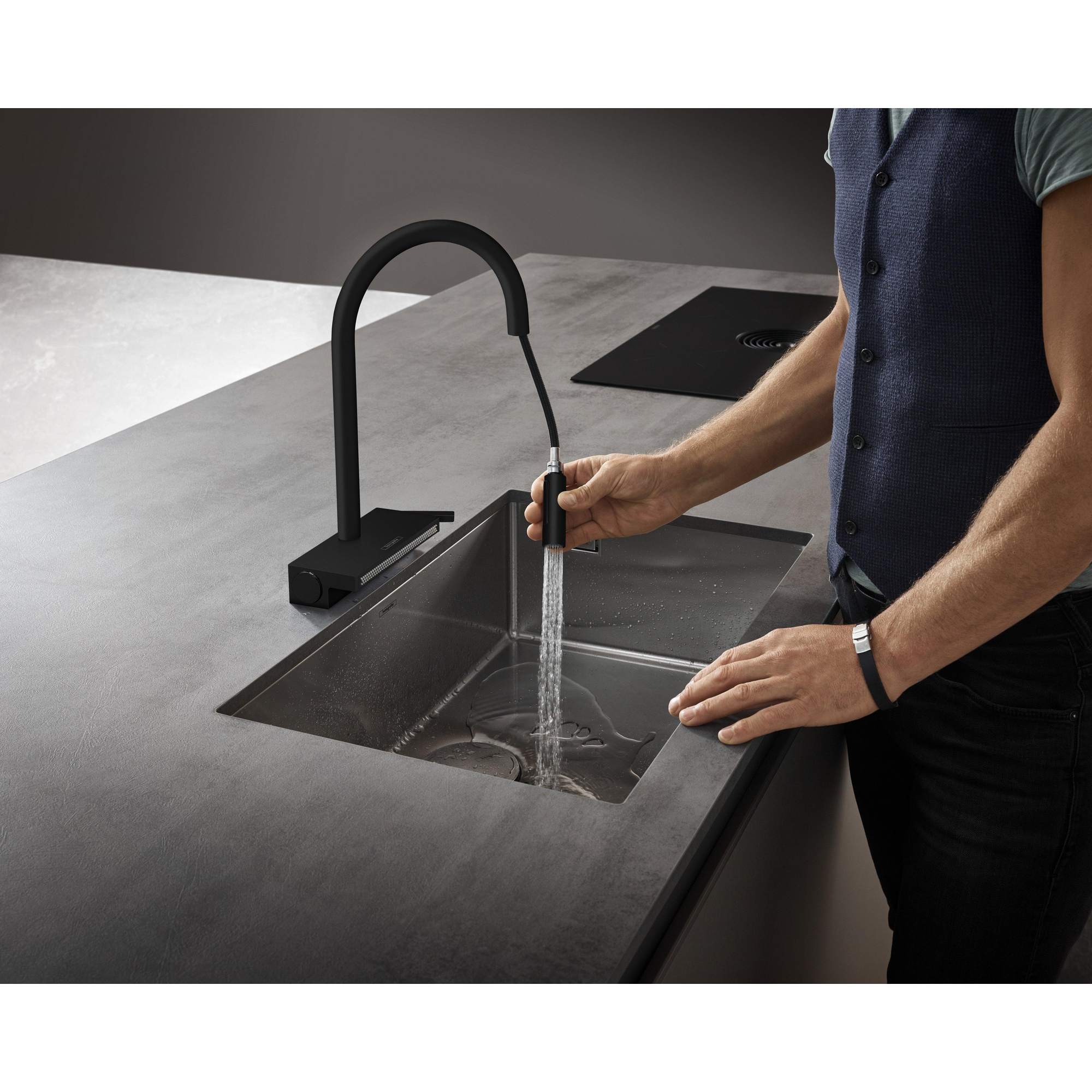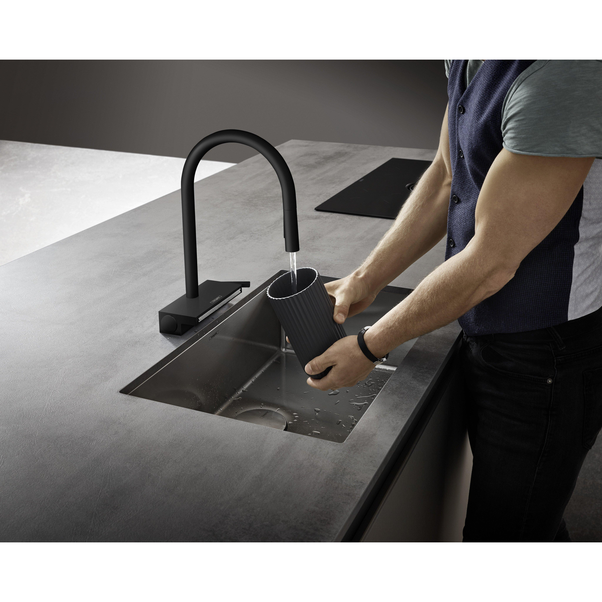Stel je voor: een keuken waar functionaliteit en stijl moeiteloos samenkomen. Deze innovatieve mengkraan tilt jouw dagelijkse keukenroutine naar een hoger niveau met zijn verfijnde design en slimme technologieën. Dankzij de soepele bediening en veelzijdige straalsoorten werk je efficiënter en met meer plezier. Of je nu snel een pan vult, delicate groenten zachtjes spoelt of de spoelbak schoonmaakt, deze kraan past zich moeiteloos aan jouw wensen aan. De combinatie van een strak matzwarte afwerking en een elegante, hoge uitloop zorgt ervoor dat jouw keuken er niet alleen modern uitziet, maar ook uitnodigt tot creatief koken en ontspannen momenten. Met deze kraan wordt elke handeling in de keuken een genot, waarbij comfort en duurzaamheid hand in hand gaan.