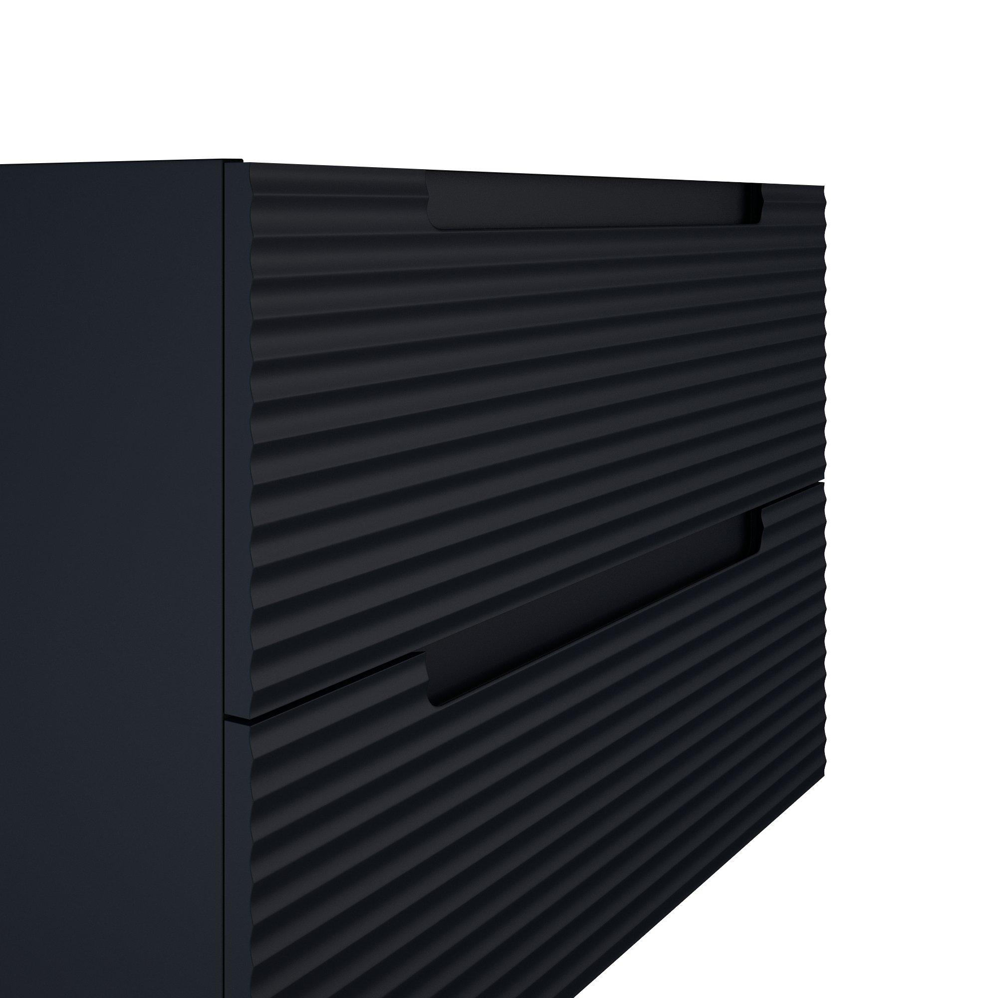 Met dit meubel geef je jouw badkamer direct een stijlvolle en praktische upgrade. Het unieke, horizontaal gestreepte 3D-front zorgt voor een opvallende uitstraling die je badkamer een moderne en frisse sfeer geeft. Dankzij de mat marine blauwe kleur krijgt de ruimte een chique en tegelijk stoere touch, perfect voor wie houdt van een eigentijdse inrichting. Dit meubel is niet alleen een lust voor het oog, maar ook een slimme oplossing om je badkamer netjes en overzichtelijk te houden. Door de vier ruime lades berg je al je verzorgingsproducten en accessoires eenvoudig op, zodat je altijd een opgeruimde en rustgevende badkamer hebt. De geïntegreerde grepen zorgen voor een strakke, greeploze look die moeiteloos combineert met verschillende wastafels en badkamerstijlen. Zo transformeer je jouw badkamer in een plek waar functionaliteit en design hand in hand gaan.