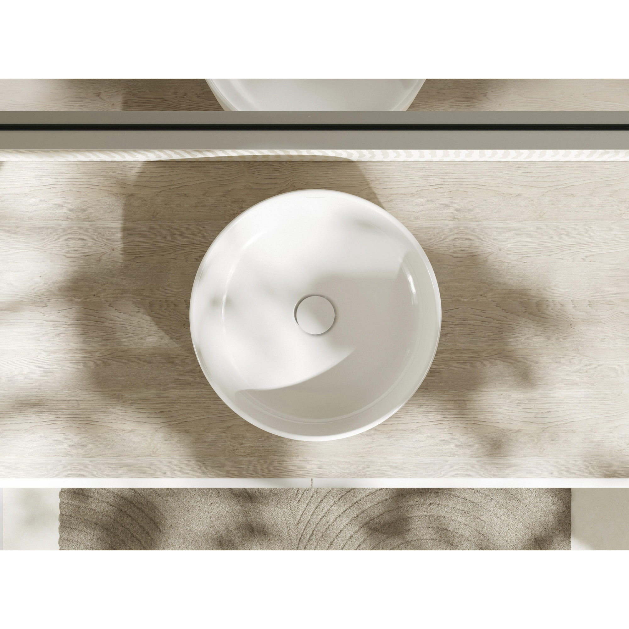 Het ronde silhouet van deze waskom biedt een zachte, uitnodigende vorm en past goed bij zowel klassieke als moderne meubelstijlen. Doordat er geen kraangat is, kun je zelf kiezen voor een bijpassende kraan naar jouw smaak en functie‑wensen. De afwezigheid van een overloop maakt het ontwerp extra strak en eenvoudig te reinigen.