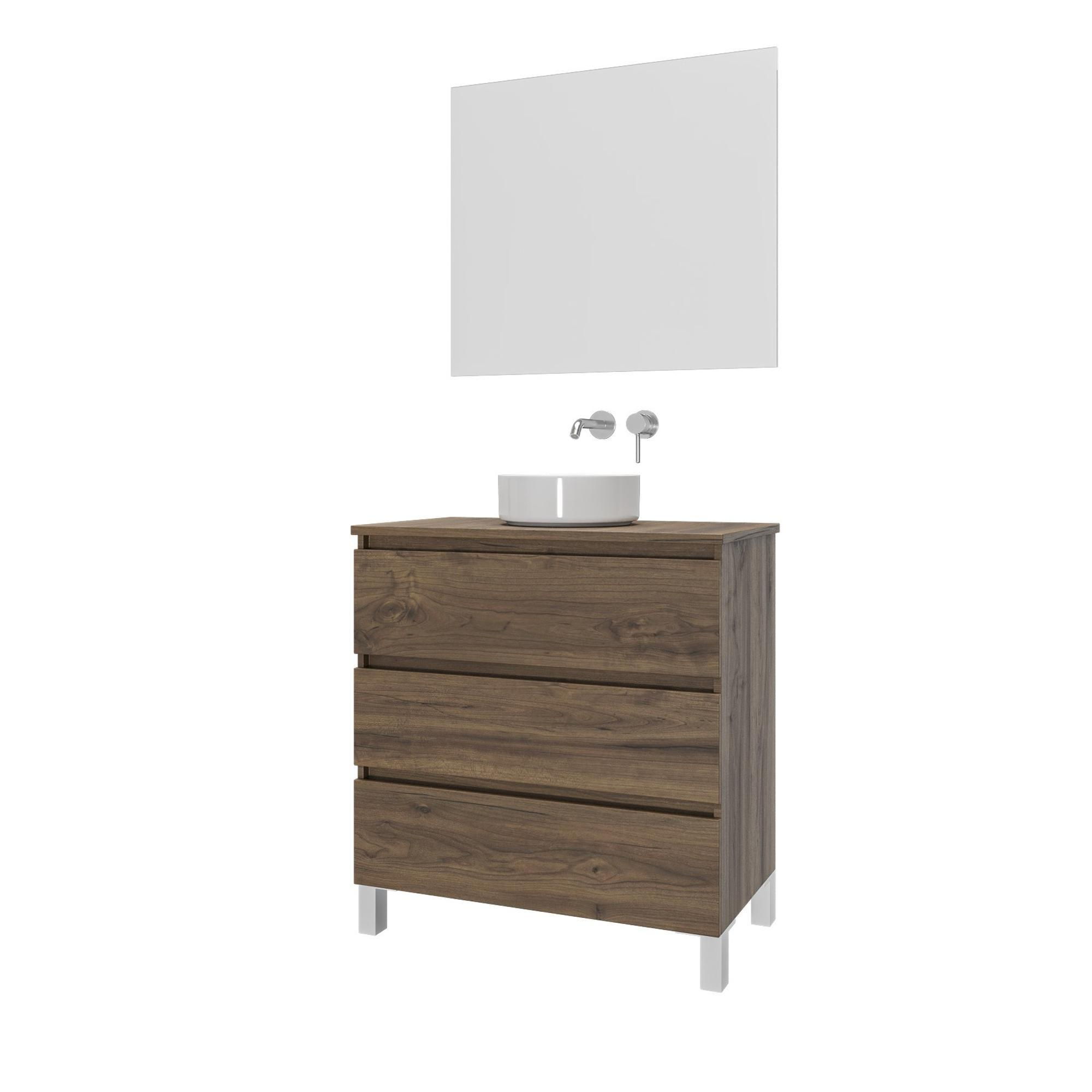 Saniclass Chaci PLUS Badkamermeubelset - 80x86x46cm - waskom - topblad - 3 lades - rechthoekige spiegel - noten