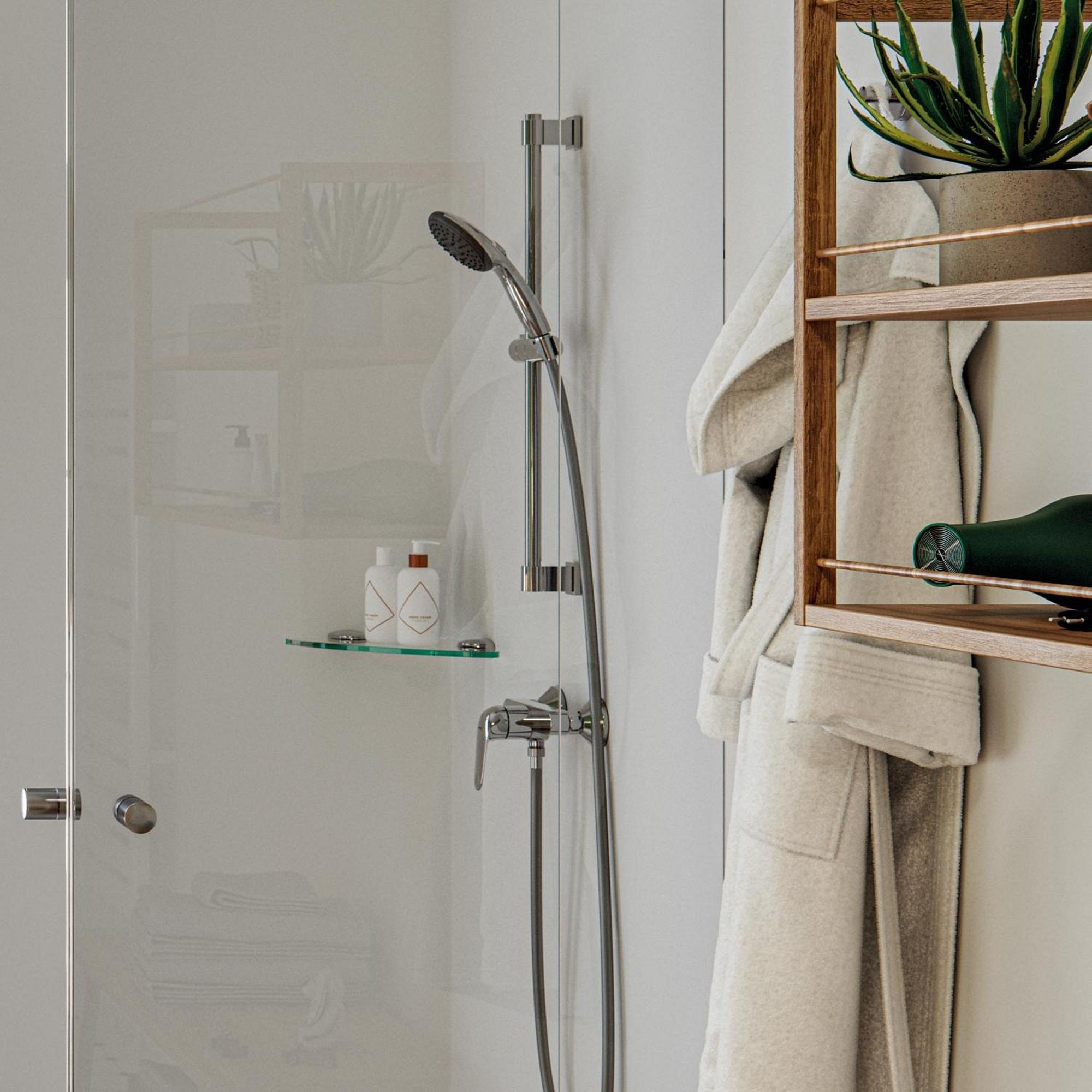 Deze douchemengkraan valt direct op door zijn moderne en minimalistische uitstraling. De chroomafwerking zorgt voor een glanzende, tijdloze look die moeiteloos aansluit bij verschillende badkamerstijlen. Of je nu een strakke, moderne badkamer hebt of een meer klassieke inrichting, deze kraan voegt een subtiel maar krachtig accent toe. Het ontwerp is niet alleen mooi, maar ook doordacht: de metalen greep ligt prettig in de hand en maakt het regelen van water een genot. Zo combineer je esthetiek met gebruiksgemak, wat jouw badkamer een luxe uitstraling geeft.