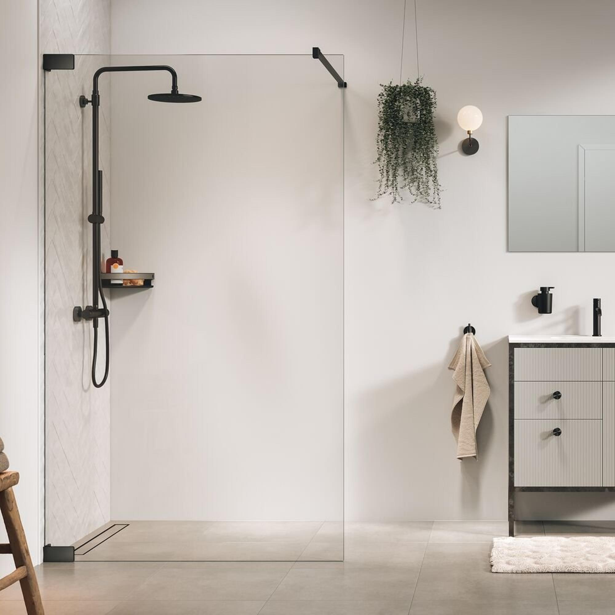 Het beslag en de profielen in gunmetal geven deze inloopdouche een verfijnde, industriële uitstraling zonder te hard of koud te worden. De gecoate afwerking zorgt voor een diepe, moderne kleur die prachtig combineert met betonlook tegels, houttinten en zwarte of geborsteld metalen kranen. Zo kun je jouw badkamerinrichting mooi op elkaar afstemmen en een consistente stijl creëren. Omdat de kleur in de grijsreeks valt, is dit een tijdloze keuze die niet snel uit de mode raakt. Ook praktisch: de wand wordt aan de muur gemonteerd met een stevige steun, zodat het geheel strak en stabiel blijft, zowel bij intensief dagelijks gebruik als op de langere termijn.
