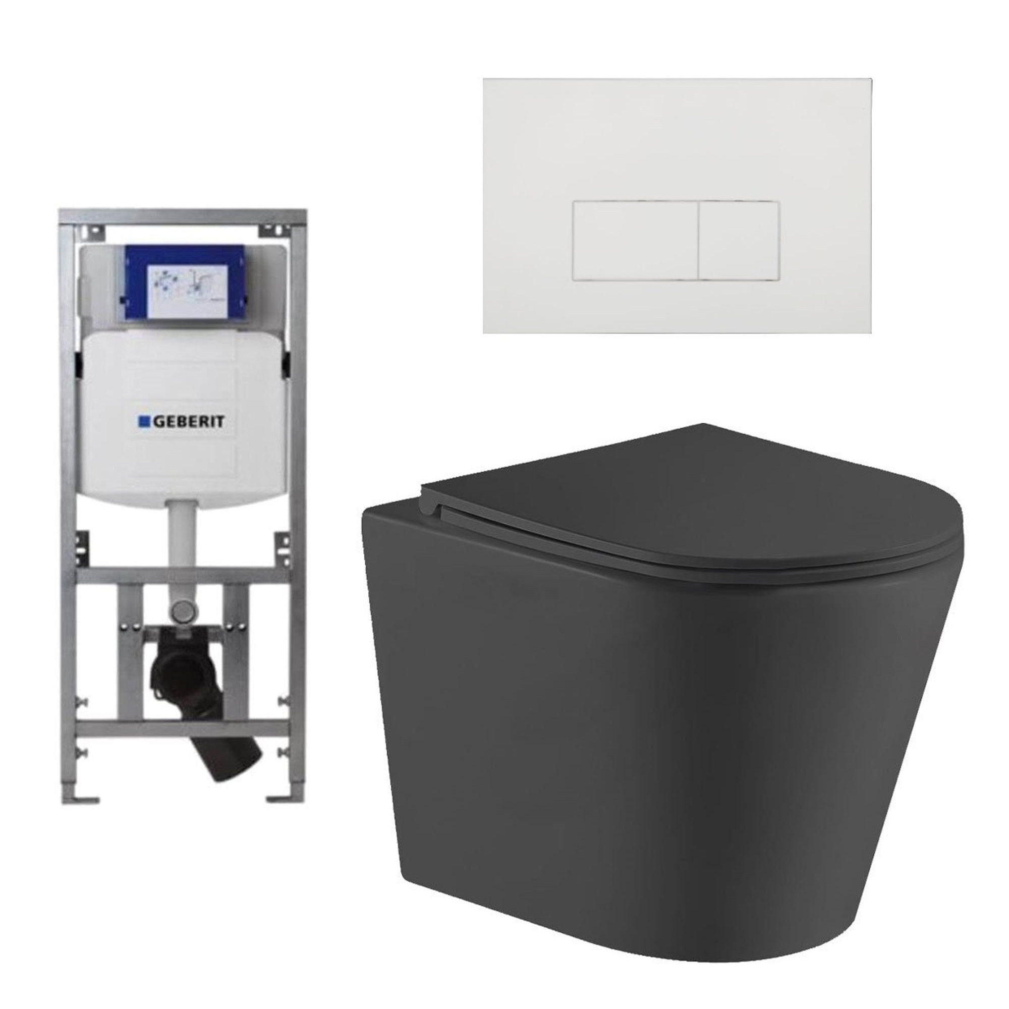 QeramiQ Dely Toiletset - 36.3x51.7cm - diepspoel - rimless - Geberit UP320 inbouwreservoir - softclose toiletzitting - glans witte bedieningsplaat - rechtehoekige knoppen - mat zwart