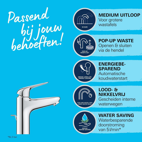 Deze kraan is gebouwd om lang mee te gaan. Dankzij de hoogwaardige keramische cartouche met GROHE Long-Life Energy Saving technologie geniet je van een nauwkeurige en soepele bediening die energie bespaart. De koude start functie zorgt ervoor dat er alleen koud water stroomt wanneer de hendel in de middenstand staat, wat onnodig energieverbruik voorkomt. Daarnaast garanderen de geïsoleerde waterwegen dat het water dat uit de kraan komt vrij is van lood en nikkel, wat bijdraagt aan een gezonde en veilige waterkwaliteit.