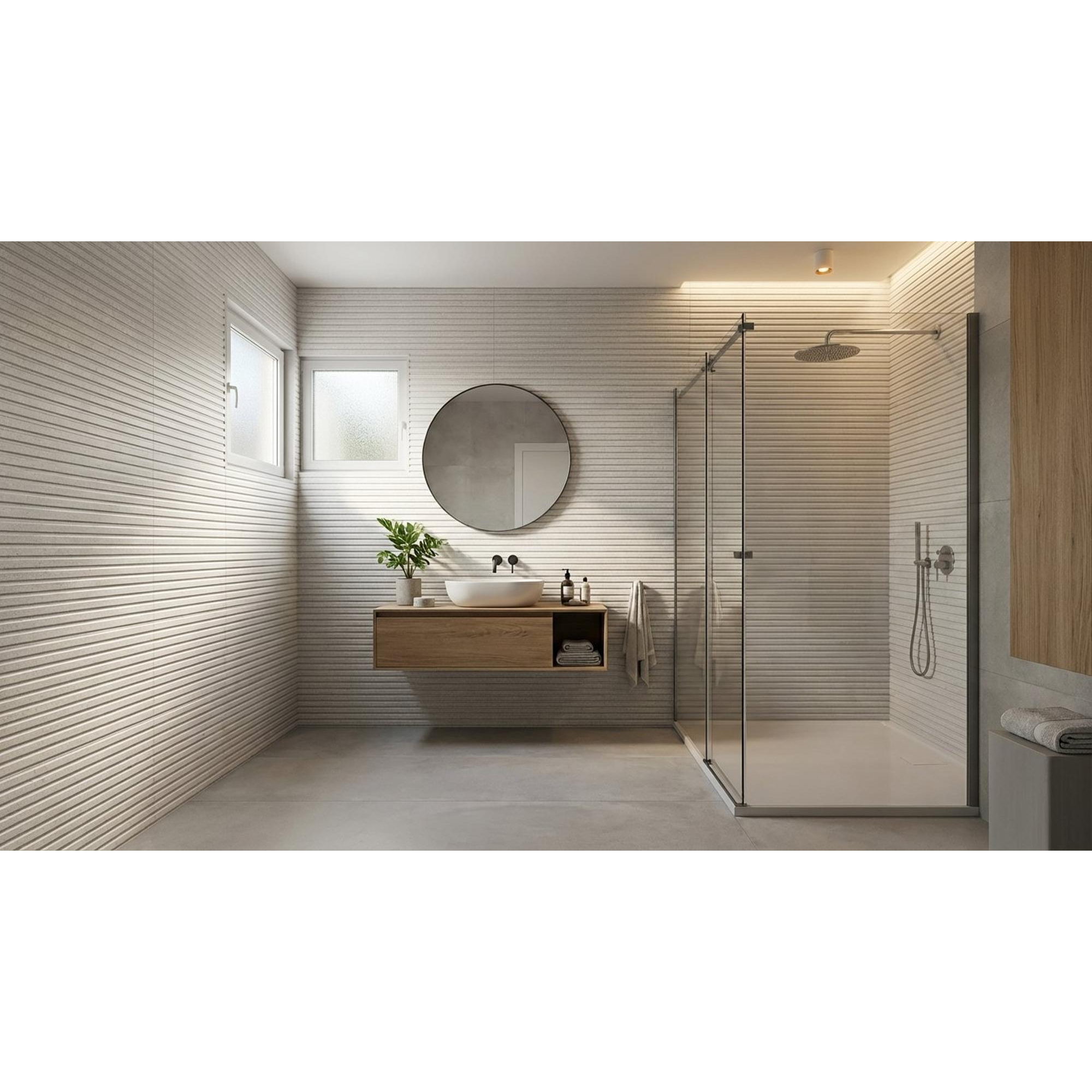 Deze wandtegel van Cifre Ceramica is onmiskenbaar stijlvol en voegt een eigentijdse uitstraling toe aan elke ruimte. De betonlook in combinatie met het matte witte decor zorgt voor een verfijnde en moderne sfeer. De strakke lijnen en het gerectificeerde formaat van de tegel dragen bij aan een naadloze afwerking die elke ruimte transformeert tot een oase van rust en schoonheid.