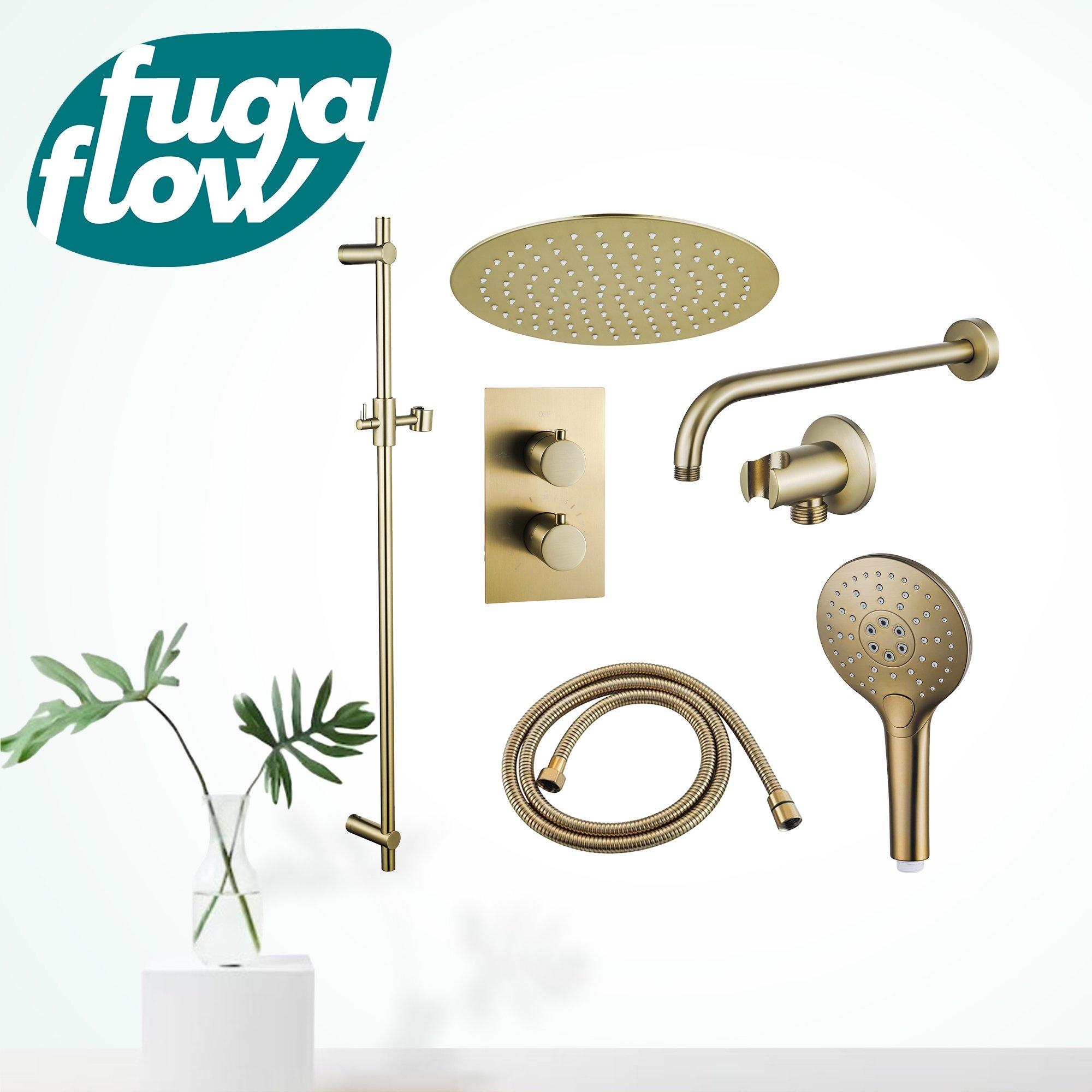 FugaFlow Eccelente Sobrado Badkamer Inbouw Regendoucheset - thermostatisch - wandarm -glijstang - 25cm hoofddouche - handdouche rond- geborsteld messing PVD