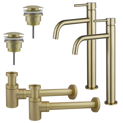 FugaFlow Eccelente Sobrado Slim Wastafelkraanset - voor dubbele wastafel - verhoogde wastafelkraan - klikwaste plug - verlaagde design sifon - PVD Geborsteld Messing