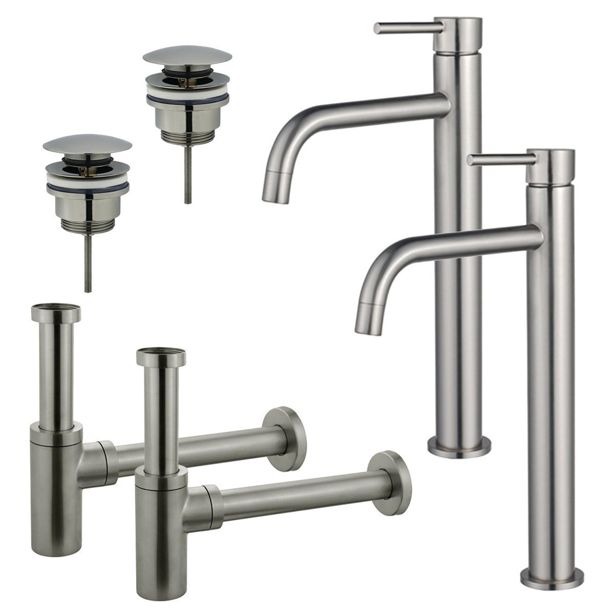 FugaFlow Eccelente Sobrado Slim Wastafelkraanset - voor dubbele wastafel - verhoogde wastafelkraan - klikwaste plug - design sifon - PVD Geborsteld RVS