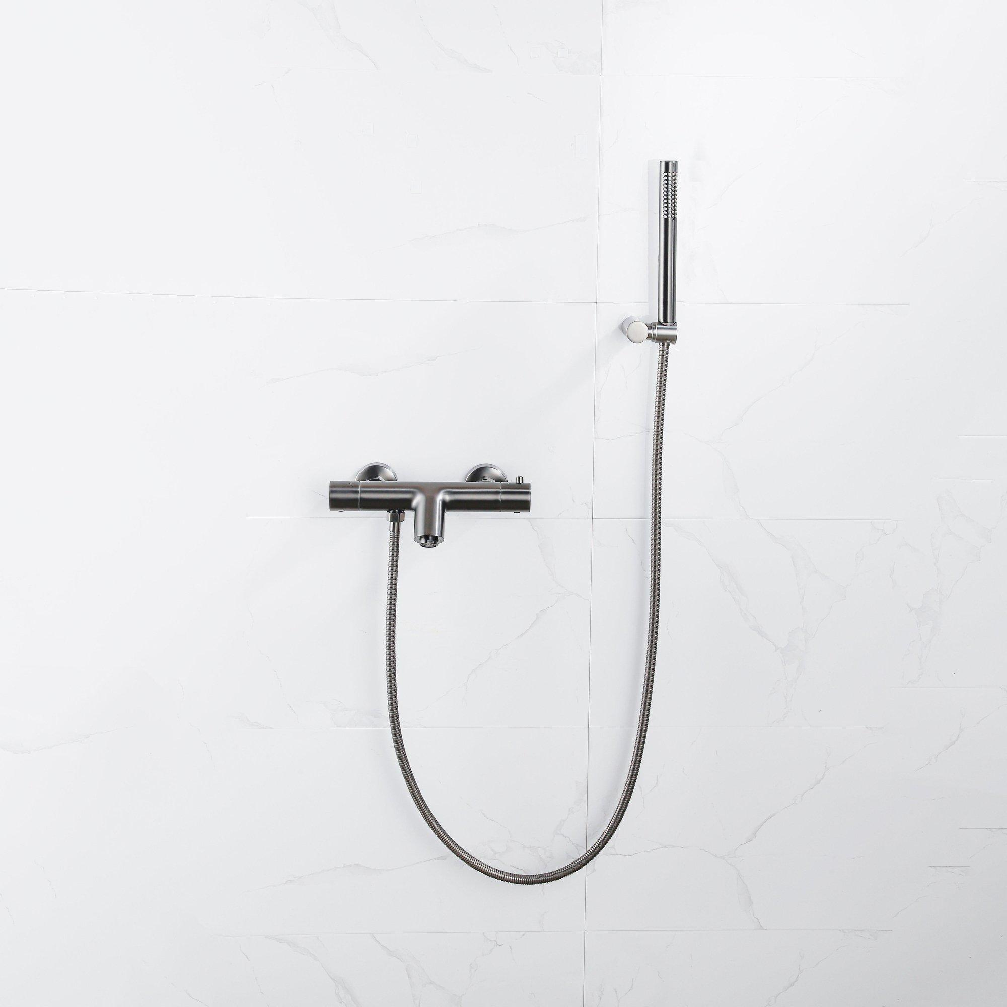 FugaFlow Eccelente Sobrado Badkamer Thermostatische badkraan met staafhanddouche, handdouchehouder en metalen doucheslang Gunmetal PVD