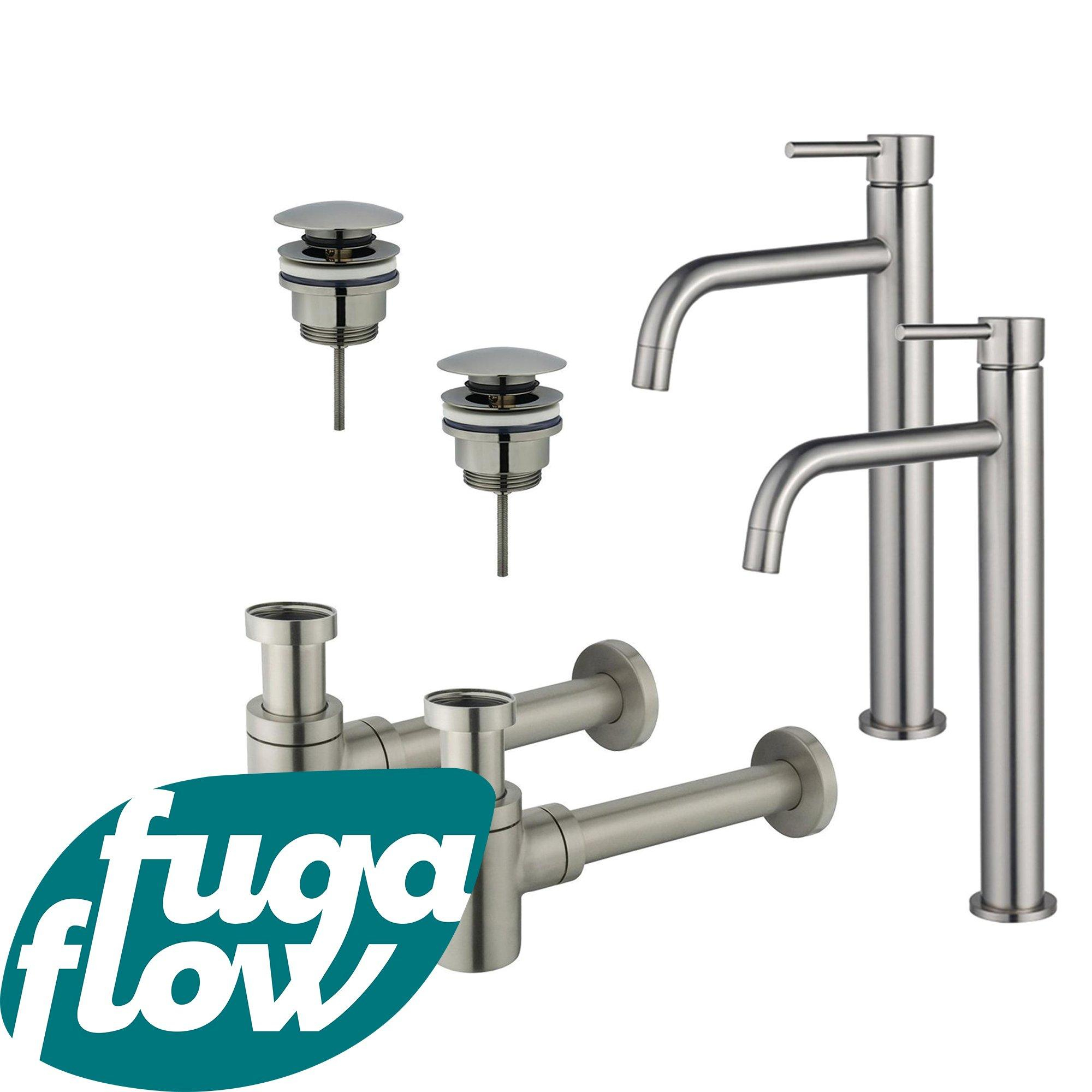FugaFlow Eccelente Sobrado Slim Wastafelkraanset - voor dubbele wastafel - verhoogde wastafelkraan - klikwaste plug - verlaagde design sifon - PVD Geborsteld RVS