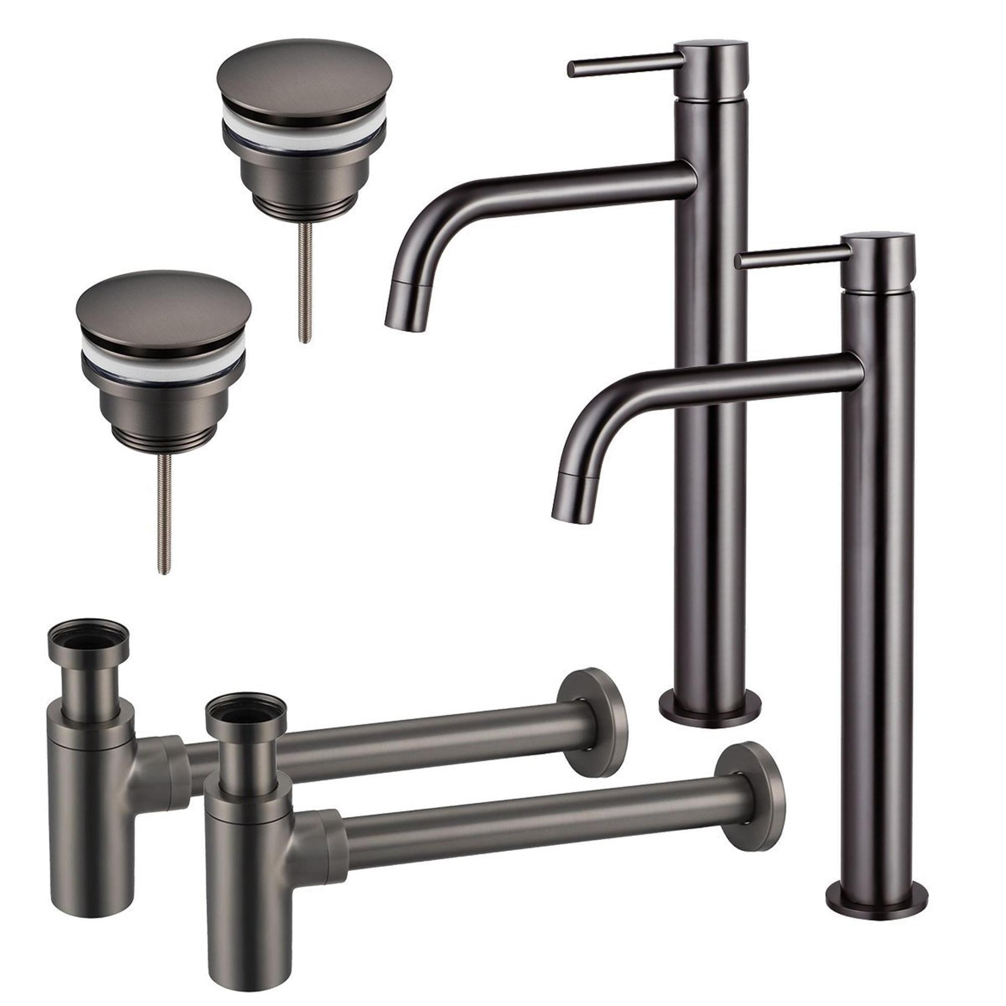 FugaFlow Eccelente Sobrado Slim Wastafelkraanset - voor dubbele wastafel - verhoogde wastafelkraan - klikwaste plug - design sifon - PVD Gepolijst Gunmetal