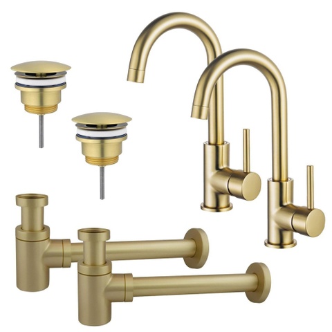 FugaFlow Eccelente Sobrado Wastafelkraanset - voor dubbele wastafel - hoge wastafelkraan - draaibare uitloop - always open plug - verlaagde design sifon - PVD Geborsteld Messing