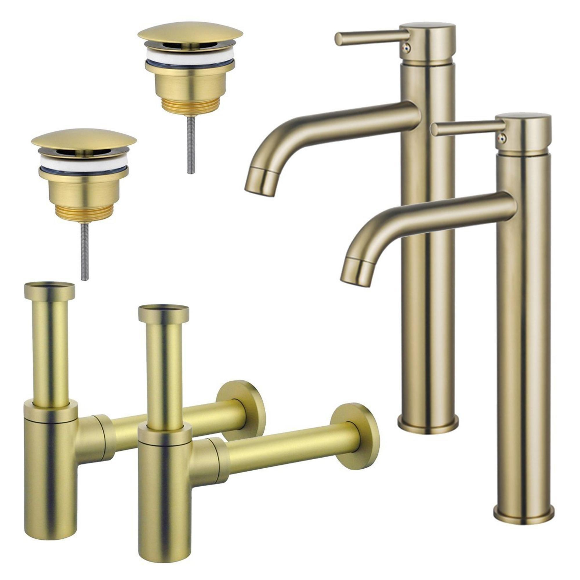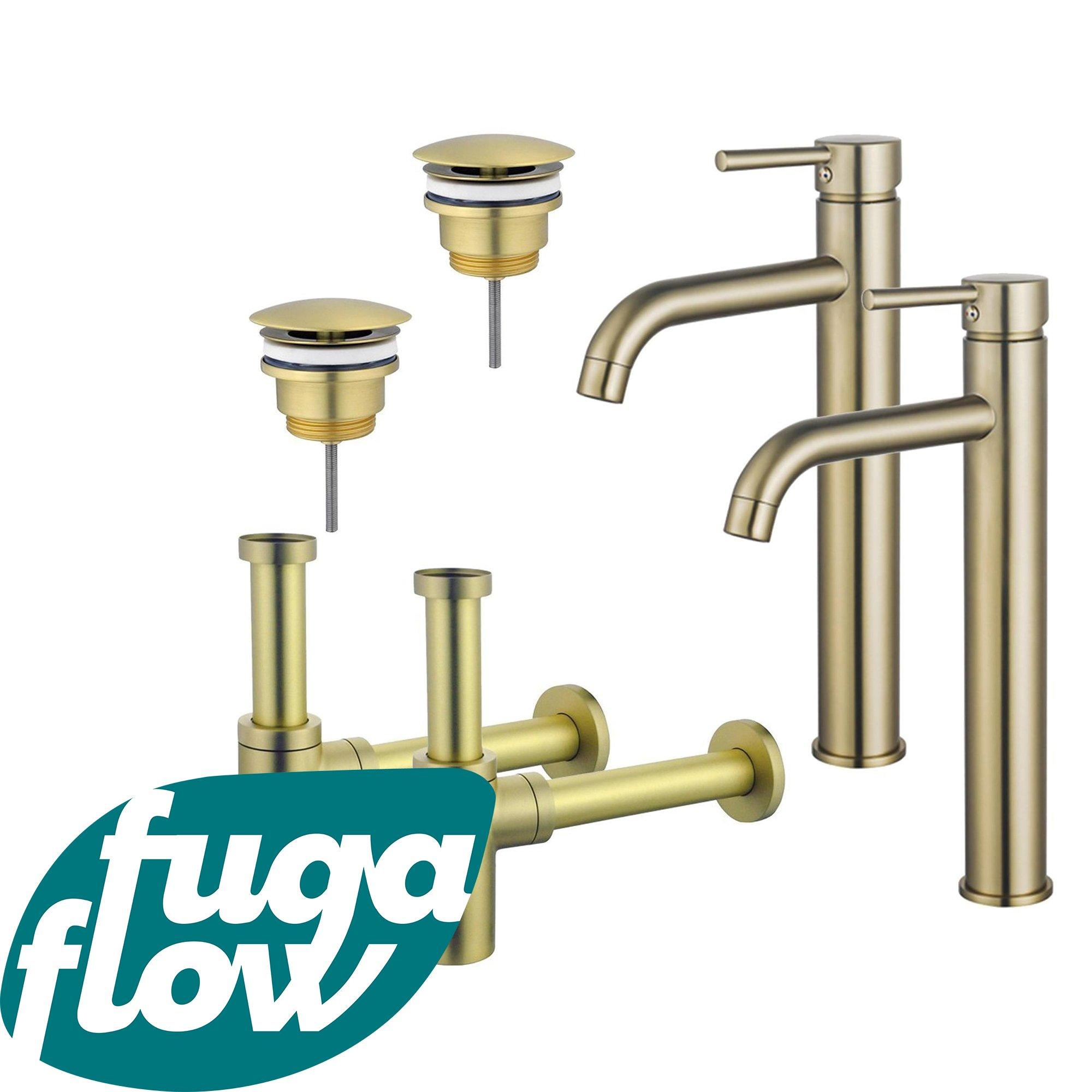 FugaFlow Eccelente Sobrado Wastafelkraanset - voor dubbele wastafel - verhoogde wastafelkraan - always open plug - design sifon - PVD Geborsteld Messing
