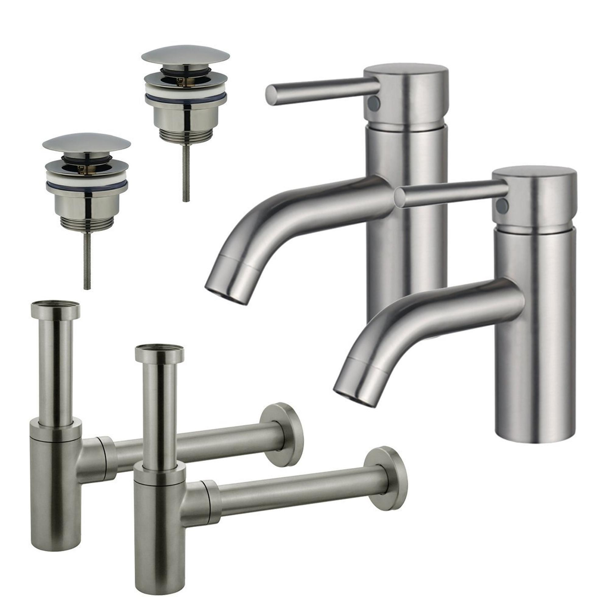 FugaFlow Eccelente Sobrado Wastafelkraanset - voor dubbele wastafel - lage wastafelkraan - klikwaste plug - design sifon - PVD Geborsteld RVS