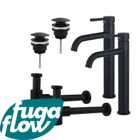 FugaFlow Eccelente Sobrado Wastafelkraanset - voor dubbele wastafel - verhoogde wastafelkraan - klikwaste plug - verlaagde design sifon - Mat zwart
