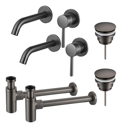 FugaFlow Eccelente Sobrado Wastafelkraanset - voor dubbele wastafel - inbouw wastafelkraan - klikwaste plug - design sifon - PVD Gepolijst Gunmetal