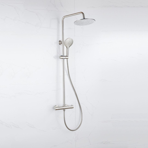 De FugaFlow Eccelente Sobrado Regendoucheset is een prachtige toevoeging aan elke badkamer, met zijn elegante design en hoogwaardige afwerking. Deze set omvat een thermostatische regendouche met een diameter van 25 cm, een ronde handdouche en is vervaardigd uit geborsteld roestvrij staal met PVD-coating. Geniet van een luxueuze douche-ervaring met deze stijlvolle en functionele regendoucheset.