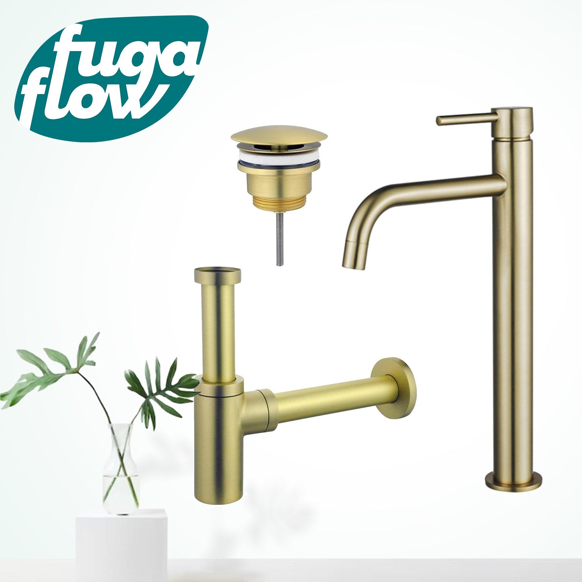 FugaFlow Eccelente Sobrado Slim Wastafelkraanset - verhoogde wastafelkraan - always open plug - design sifon - PVD Geborsteld Messing