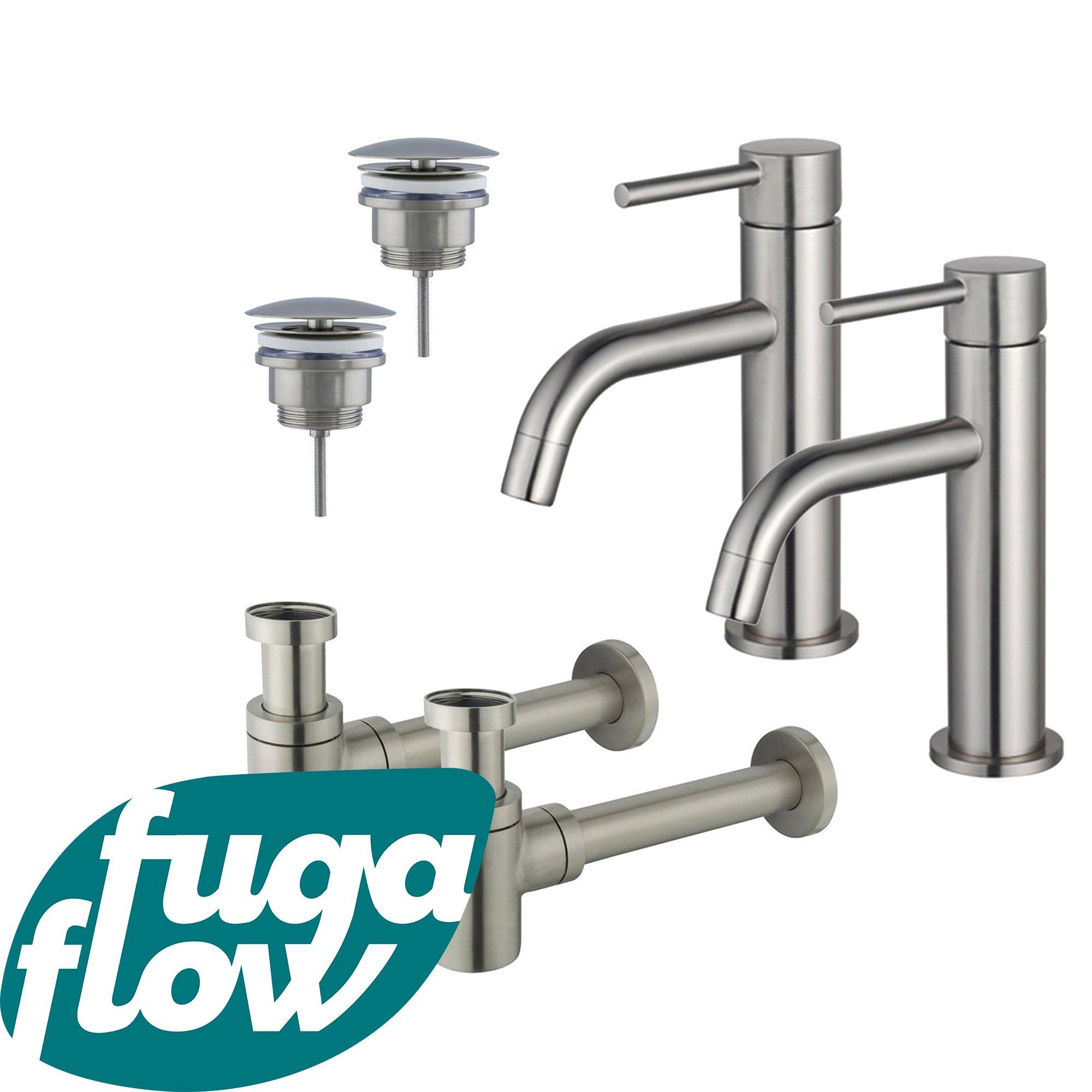 FugaFlow Eccelente Sobrado Slim Wastafelkraanset - voor dubbele wastafel - lage wastafelkraan - always open plug - verlaagde design sifon - PVD Geborsteld RVS