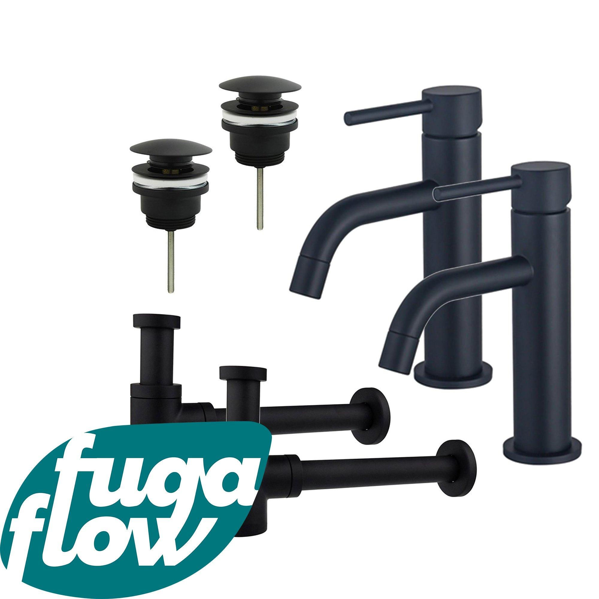 FugaFlow Eccelente Sobrado Badkamer Slim Wastafelkraanset - voor dubbele wastafel - lage wastafelkraan - klikwaste plug - verlaagde design sifon - Mat zwart