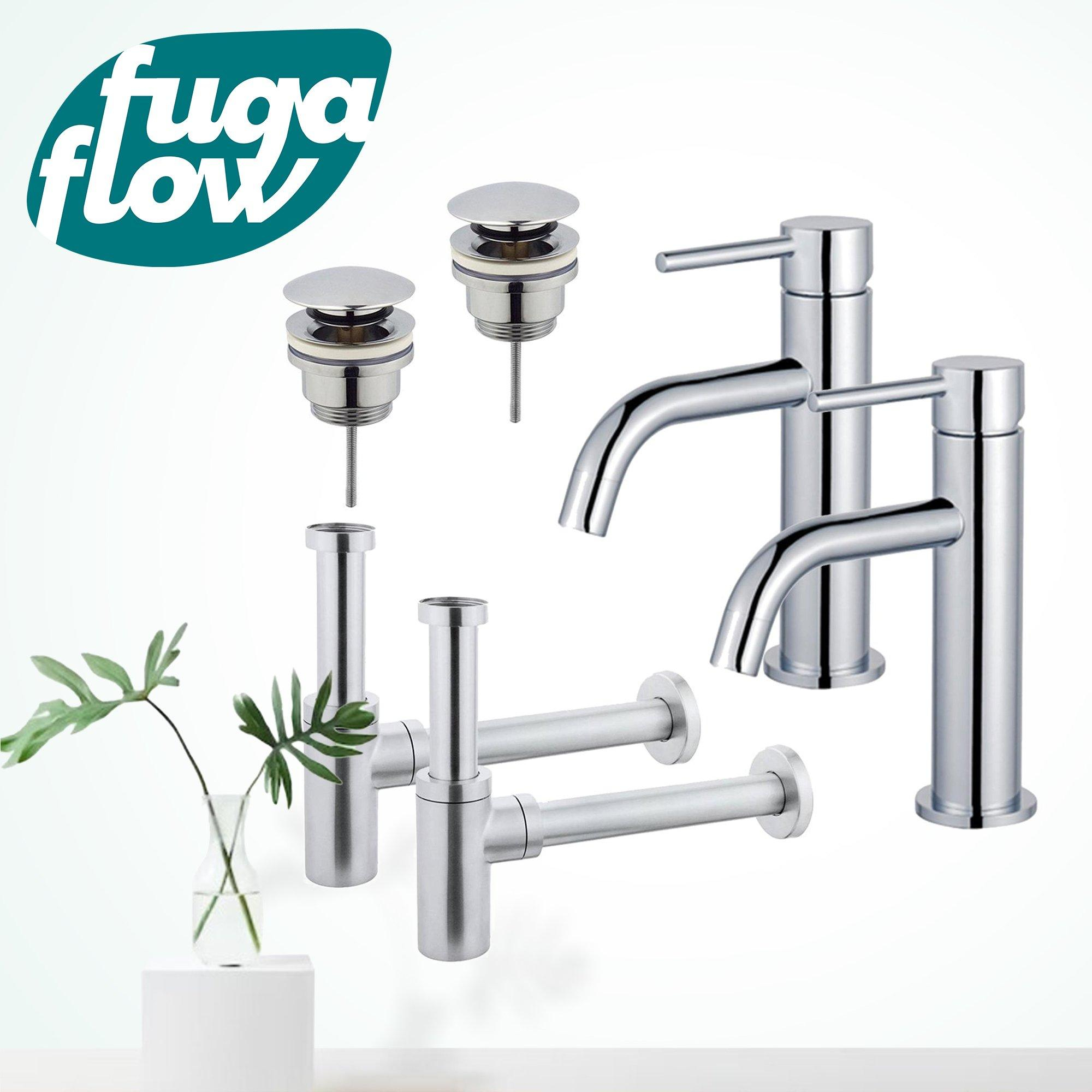 FugaFlow Eccelente Sobrado Slim Wastafelkraanset - voor dubbele wastafel - lage wastafelkraan - klikwaste plug - design sifon - Chroom