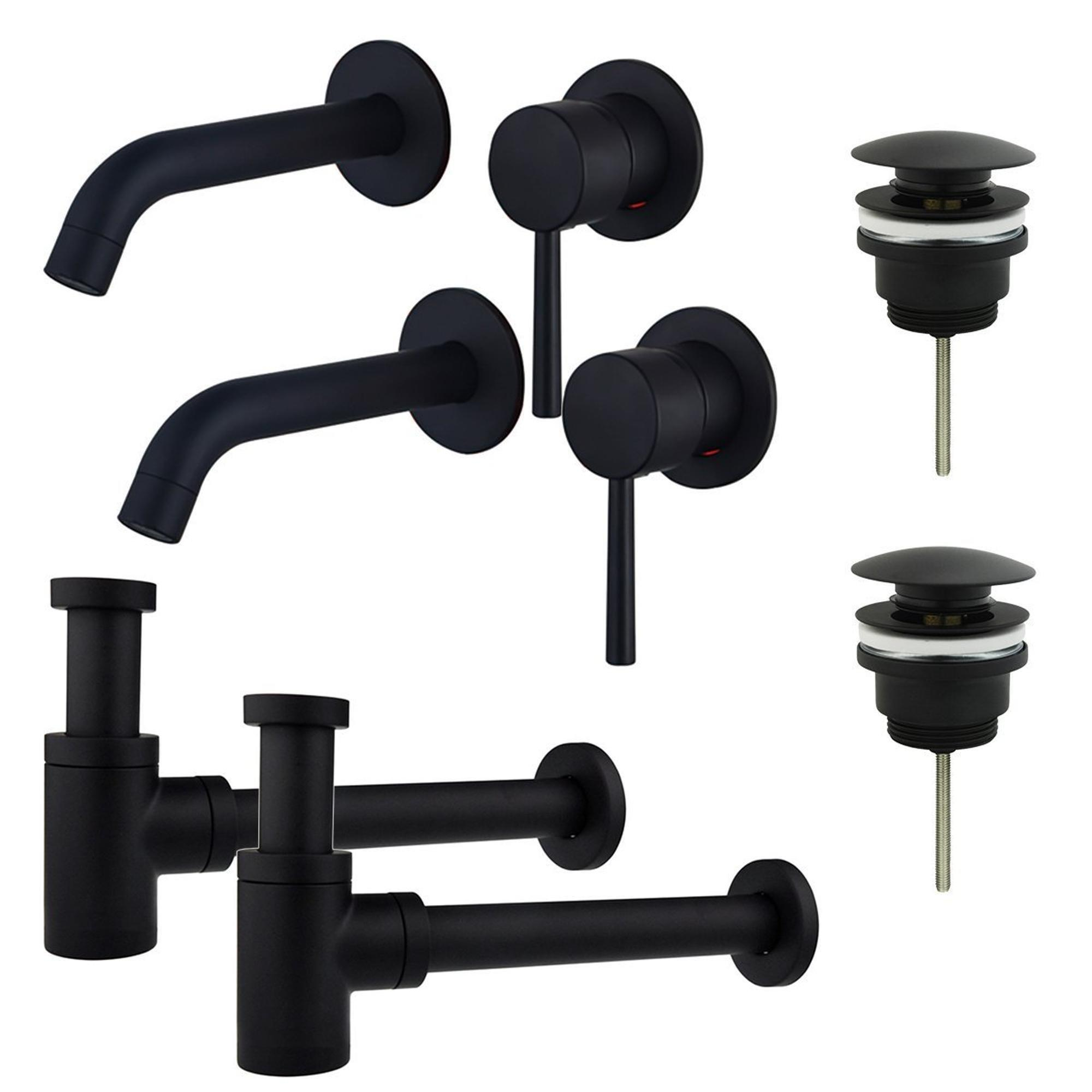 FugaFlow Eccelente Sobrado Badkamer Slim Wastafelkraanset - voor dubbele wastafel - inbouw wastafelkraan - klikwaste plug - verlaagde design sifon - Mat zwart