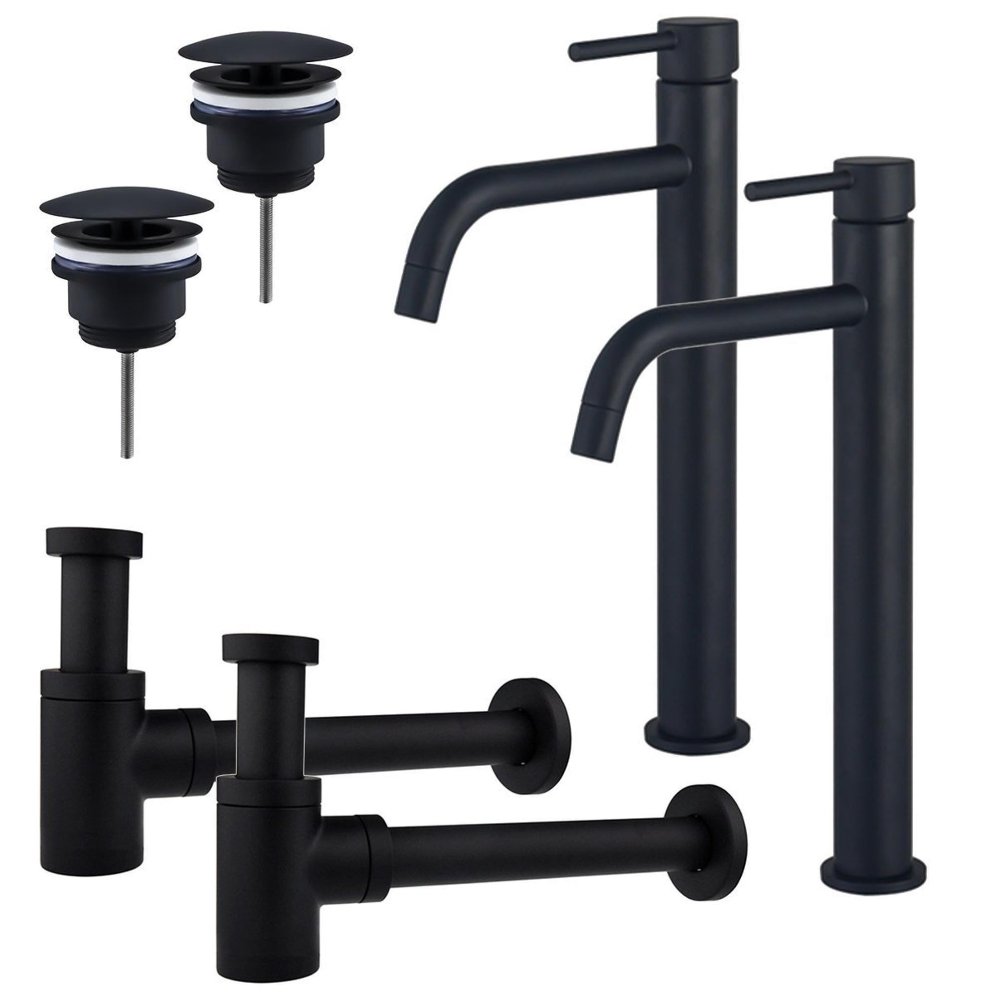 FugaFlow Eccelente Sobrado Badkamer Slim Wastafelkraanset - voor dubbele wastafel - verhoogde wastafelkraan - always open plug - verlaagde design sifon - Mat zwart