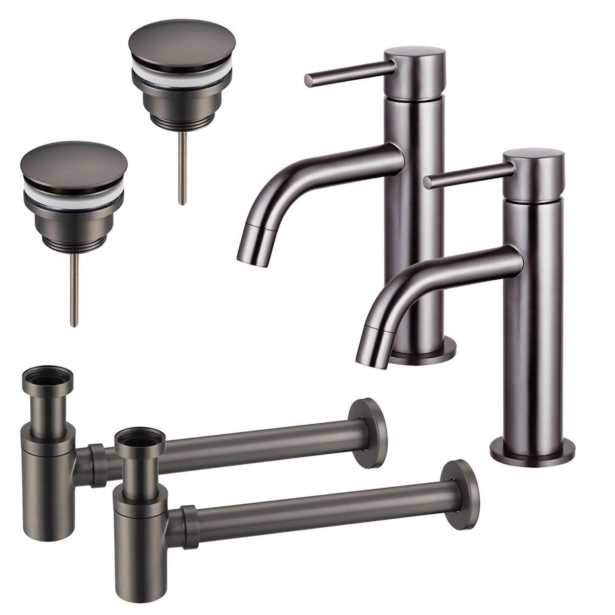 FugaFlow Eccelente Sobrado Slim Wastafelkraanset - voor dubbele wastafel - lage wastafelkraan - klikwaste plug - verlaagde design sifon - PVD Gepolijst Gunmetal