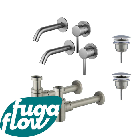 FugaFlow Eccelente Sobrado Slim Wastafelkraanset - voor dubbele wastafel - inbouw wastafelkraan - always open plug - verlaagde design sifon - PVD Geborsteld RVS
