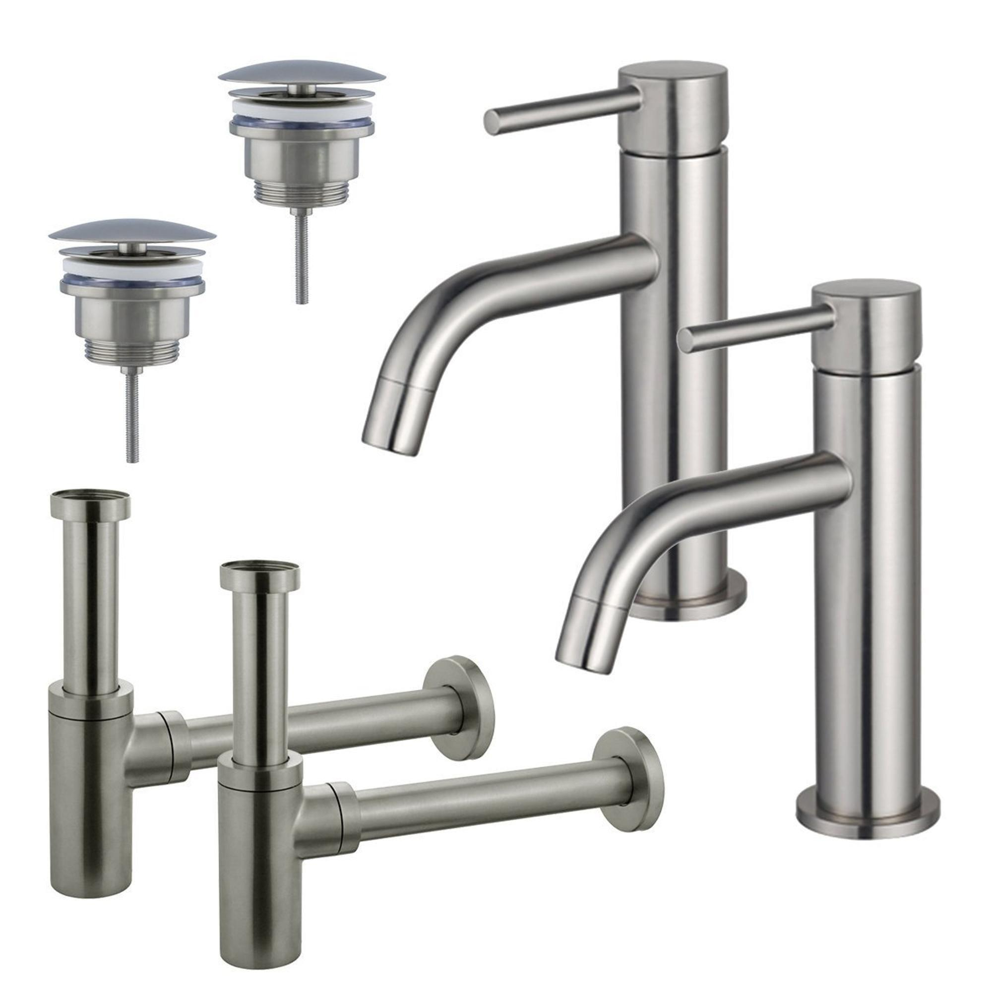 FugaFlow Eccelente Sobrado Slim Wastafelkraanset - voor dubbele wastafel - lage wastafelkraan - always open plug - design sifon - PVD Geborsteld RVS