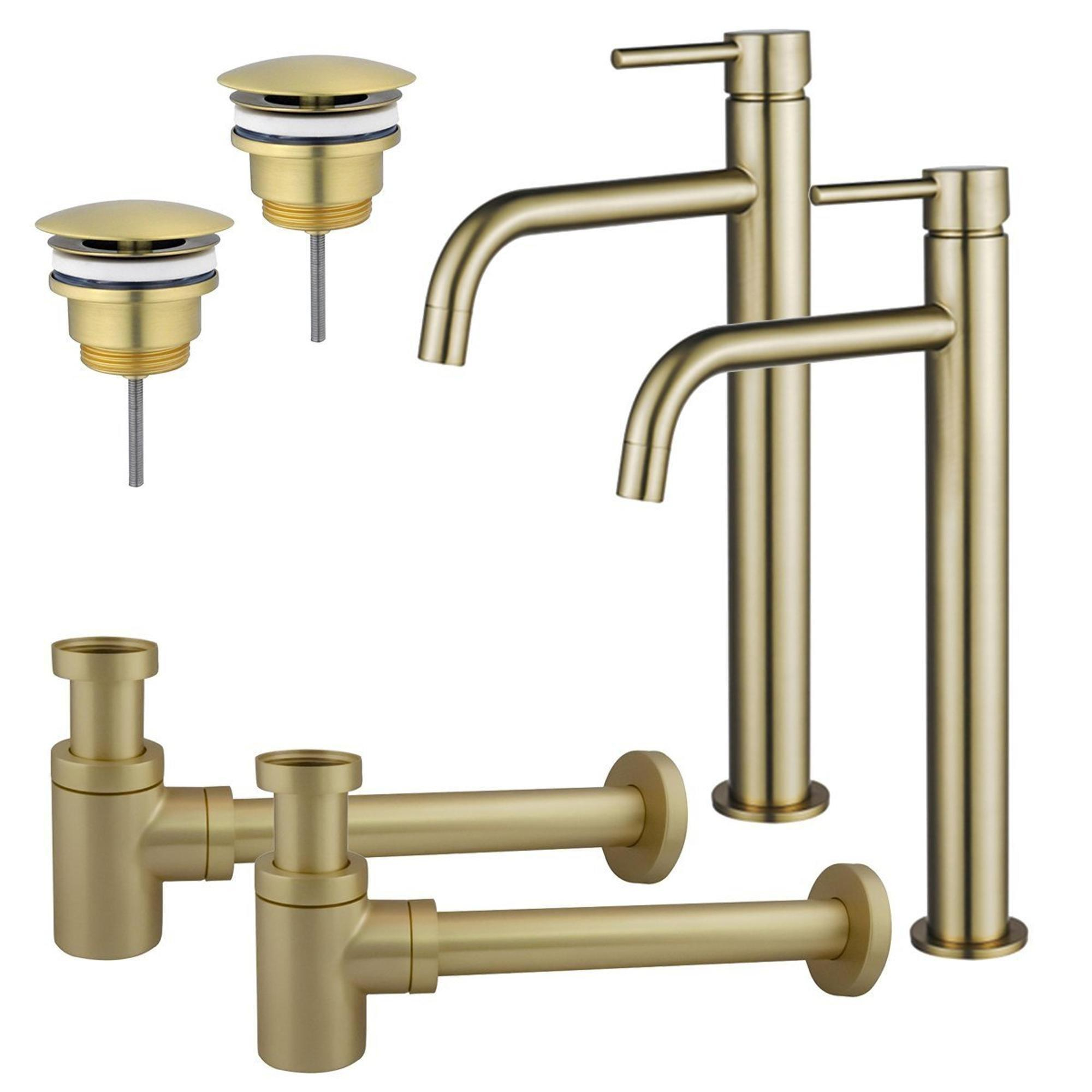 FugaFlow Eccelente Sobrado Badkamer Slim Wastafelkraanset - voor dubbele wastafel - verhoogde wastafelkraan - always open plug - verlaagde design sifon - PVD Geborsteld Messing