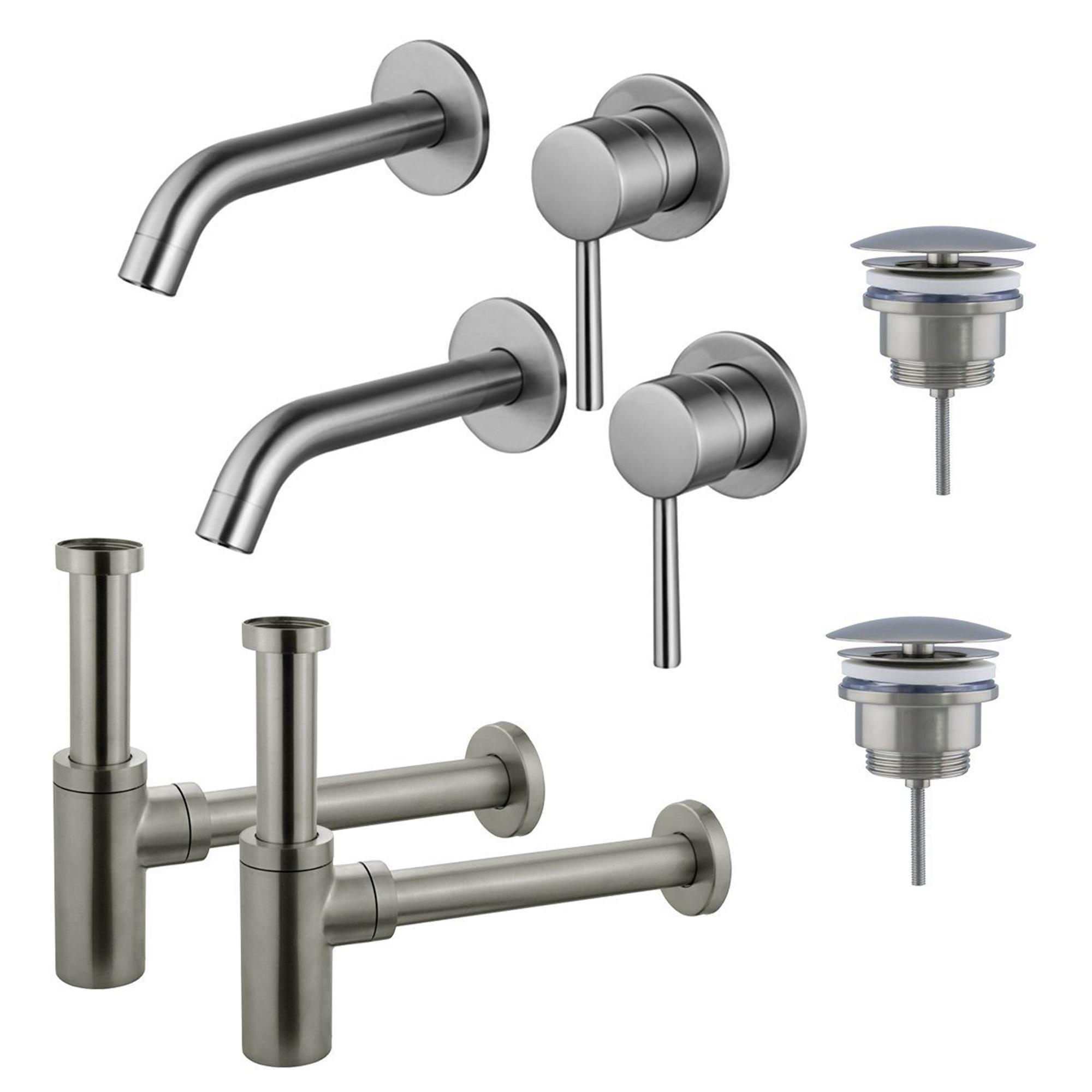 FugaFlow Eccelente Sobrado Slim Wastafelkraanset - voor dubbele wastafel - inbouw wastafelkraan - always open plug - design sifon - PVD Geborsteld RVS