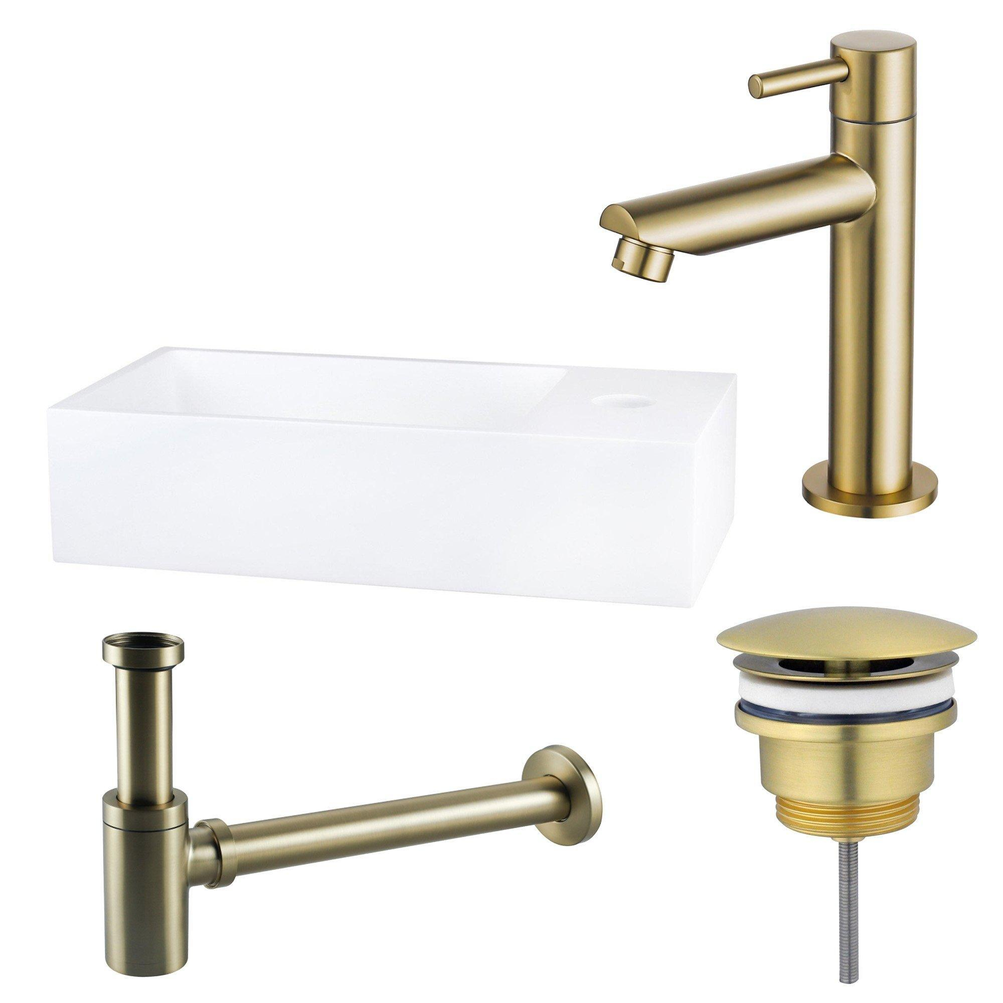 FugaFlow Eccelente Arredo fonteinset - 36x18.5x9cm - 1 kraangat - solid surface - fonteinkraan messing geborsteld - mat wit -