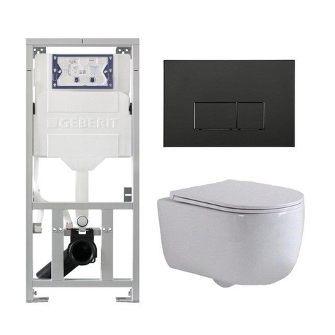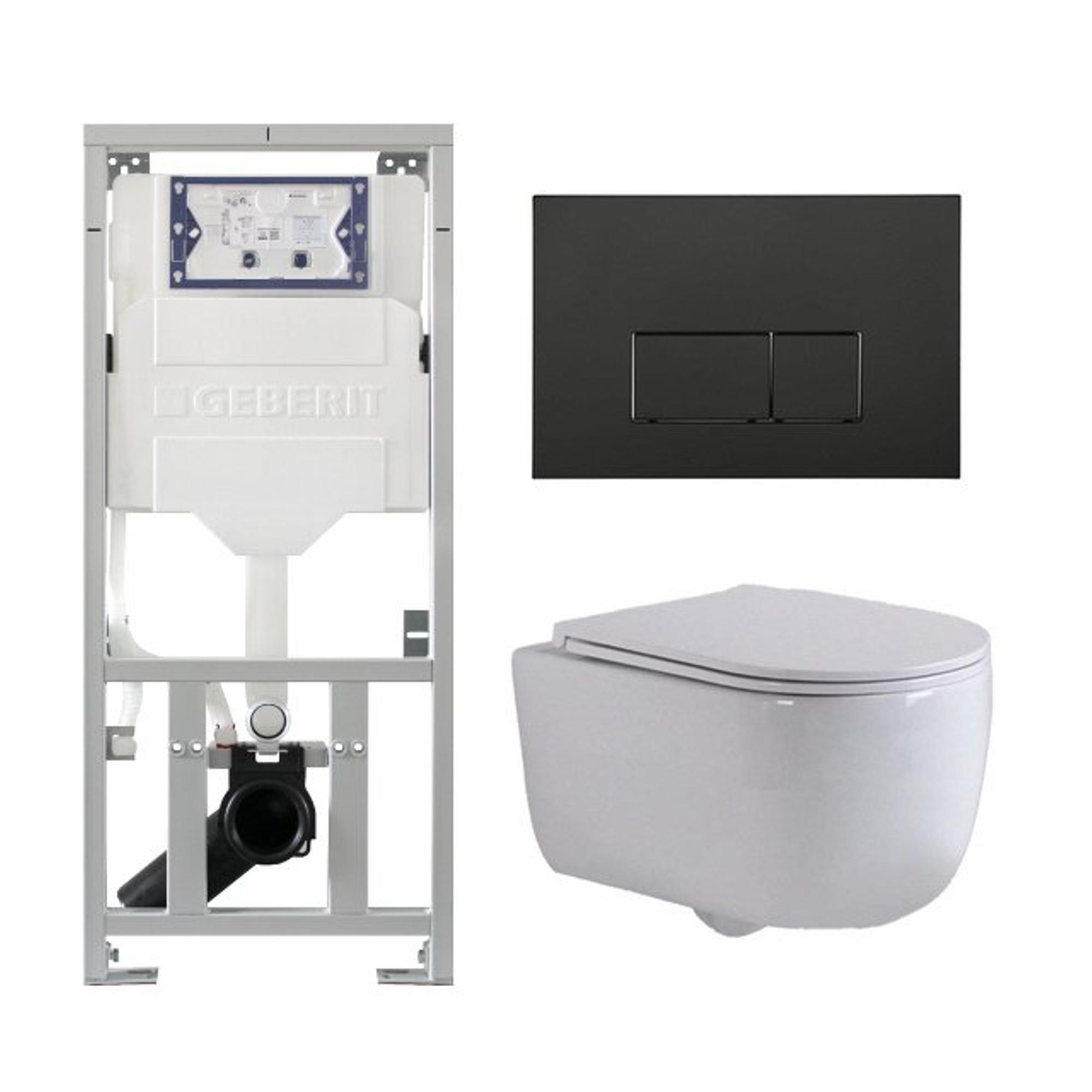 QeramiQ Dely Swirl Toiletset - 36.3x51.7cm - Geberit UP320 inbouwreservoir - met Burda frame - slim zitting - mat zwarte metalen bedieningsplaat - rechthoekige knoppen - wit glans