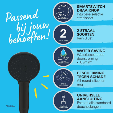 Met de innovatieve GROHE SmartSwitch kun je moeiteloos wisselen tussen twee straalsoorten: de zachte Rain Spray voor een ontspannende douche en de krachtige Jet Spray voor een gerichte reiniging. Dankzij de DreamSpray technologie is de waterverdeling altijd perfect gelijkmatig, wat zorgt voor een optimale douche-ervaring. De SpeedClean siliconen sproeigaatjes maken het schoonmaken eenvoudig en voorkomen kalkafzetting. Bovendien helpt de Water Saving doorstroombegrenzer je water te besparen zonder in te leveren op comfort. Zo geniet je van een efficiënte en aangename douche, elke dag weer.