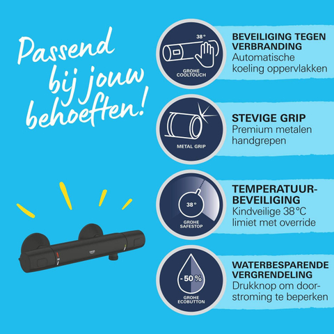 - GROHE SafeStop knop bij 38°C voor extra veiligheid