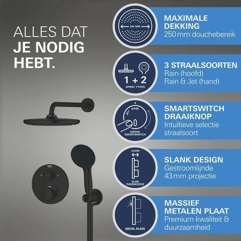 Grohe Precision showerset compleet m. handdouche ø11cm m. 2 straalsoorten en hoofddouche ø25cmm. inbouw douchekraan therm. rond m. omstel mat zwart