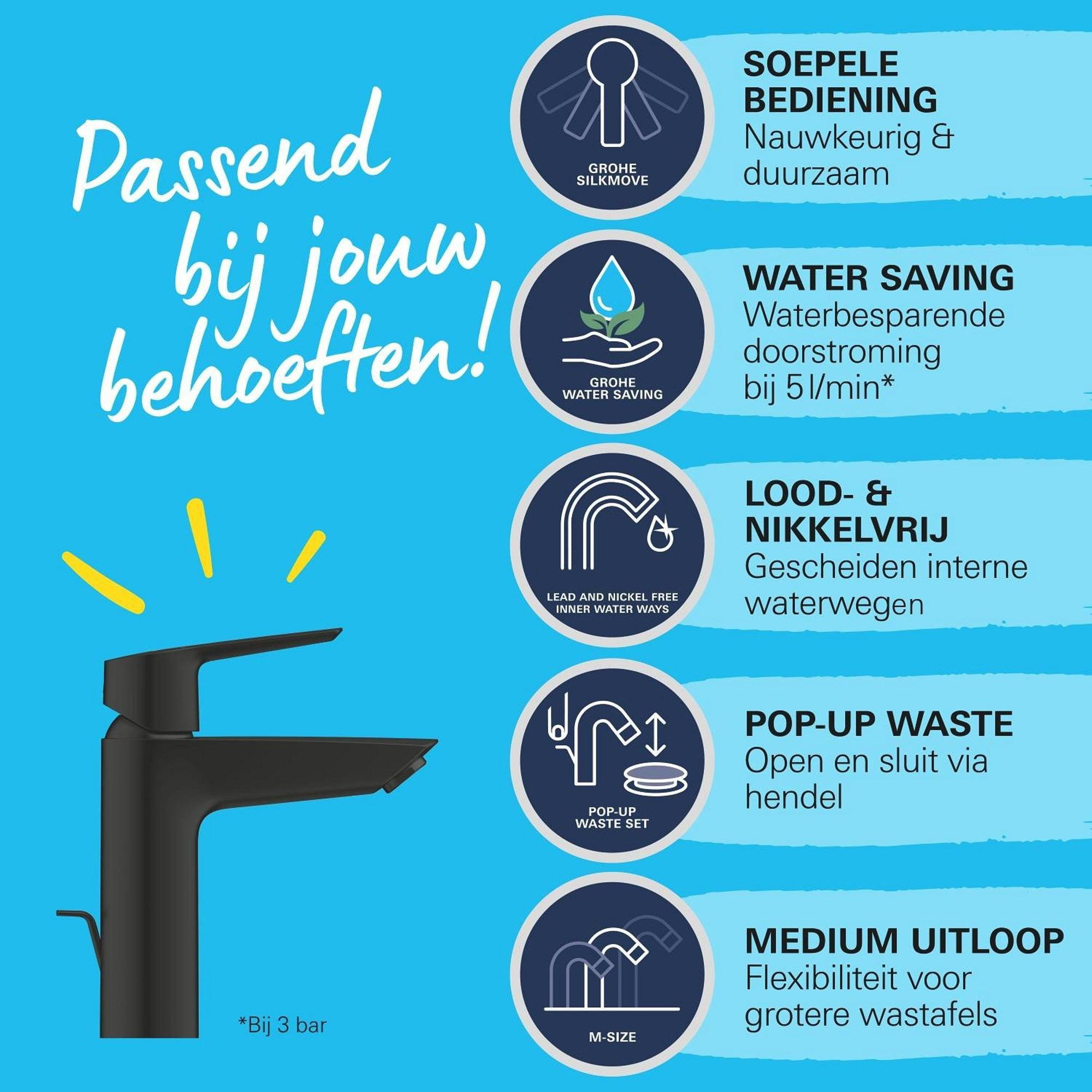 - Comfortabele middelhoogte uitloop voor optimaal gebruiksgemak