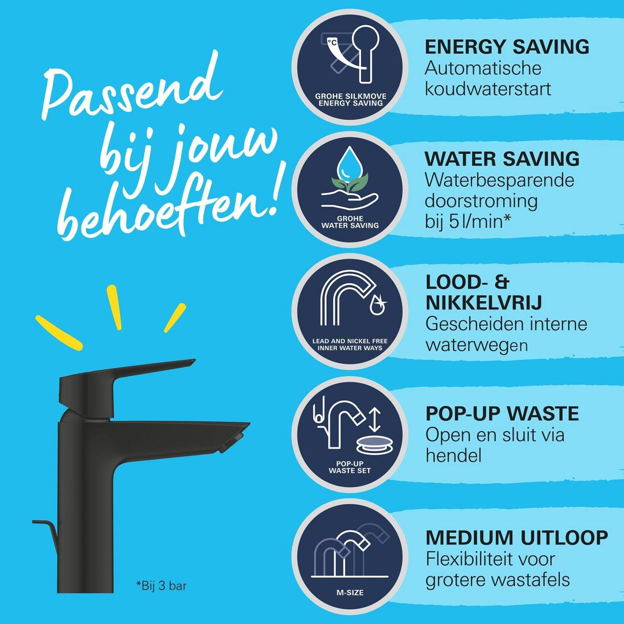 Met hoogwaardige materialen en een slijtvaste afwerking is deze kraan gebouwd om lang mee te gaan. De binnenkant is voorzien van gescheiden waterwegen, waardoor het water zuiver en vrij van lood en nikkel blijft. Dankzij de GROHE SilkMove keramische cartouche geniet je van een soepele bediening die jarenlang betrouwbaar blijft. Daarnaast zorgt de geïntegreerde koudwaterstart en waterbesparende technologie ervoor dat je minder water en energie verbruikt, zonder in te leveren op prestaties. Zo bespaar je niet alleen op je maandelijkse kosten, maar draag je ook bij aan een beter milieu.
