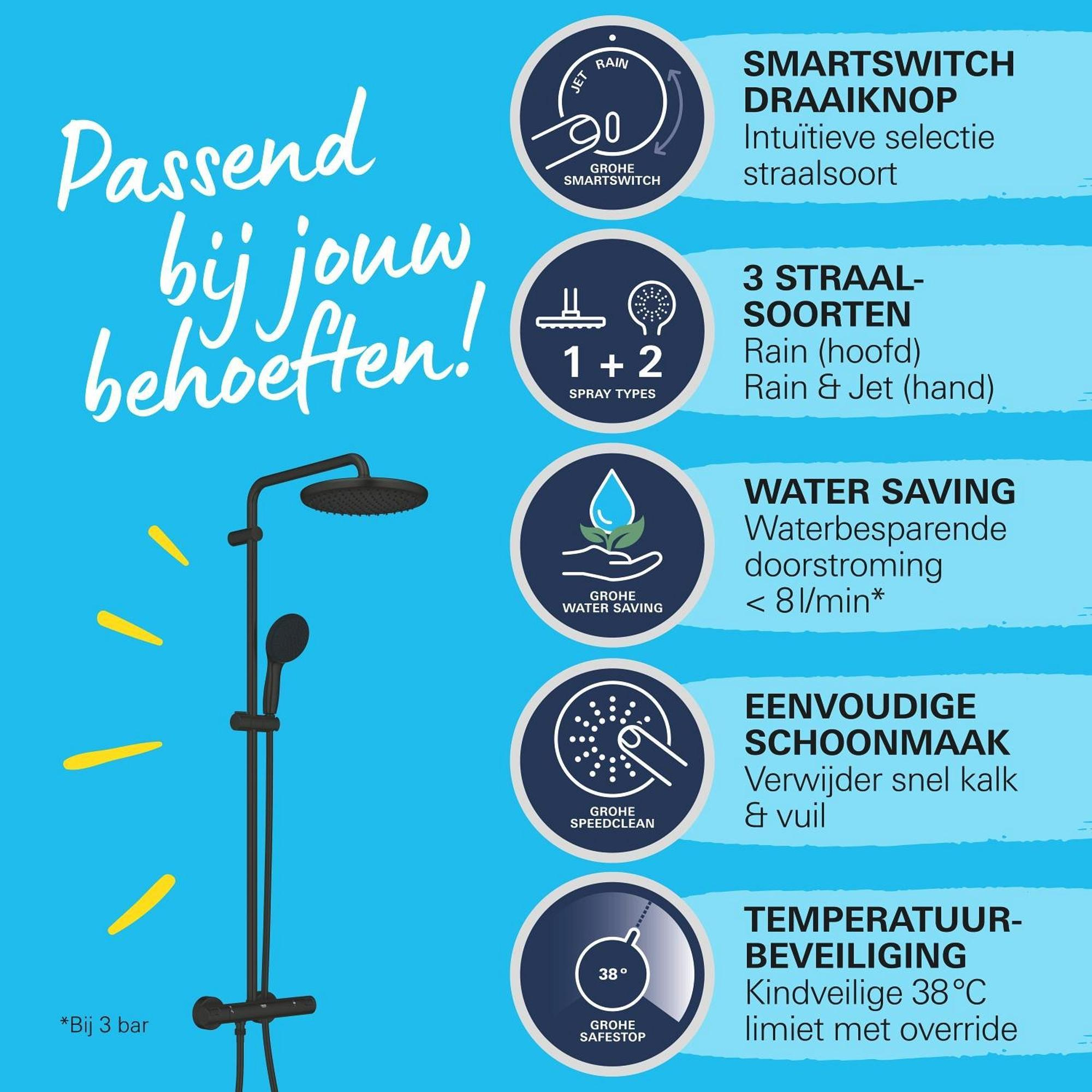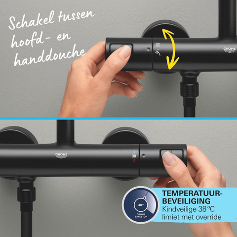 Dankzij de ingebouwde thermostaat met GROHE TurboStat technologie geniet je vrijwel direct van een constante temperatuur, zonder onaangename verrassingen. De GROHE SafeStop knop begrenst de temperatuur standaard op 38°C, met een extra veiligheidsoptie tot 43°C via de SafeStop Plus functie. Met de AquaDimmer functie schakel je eenvoudig tussen hoofd- en handdouche en regel je het watervolume moeiteloos.