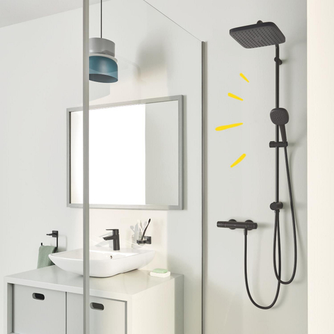 De matte zwarte afwerking geeft je badkamer een eigentijdse en luxe uitstraling die perfect aansluit bij de nieuwste interieurtrends. Dit douchesysteem is niet zomaar een functioneel element, maar een echte blikvanger die je badkamer een moderne touch geeft. Het minimalistische design met strakke lijnen zorgt ervoor dat het douchesysteem naadloos integreert in elke badkamerstijl. Bovendien blijft de afwerking jarenlang onberispelijk dankzij de duurzame GROHE Long-Life coating, die bestand is tegen krassen en verkleuring. Zo geniet je niet alleen van een mooi product, maar ook van een blijvend stijlvolle badkamer.