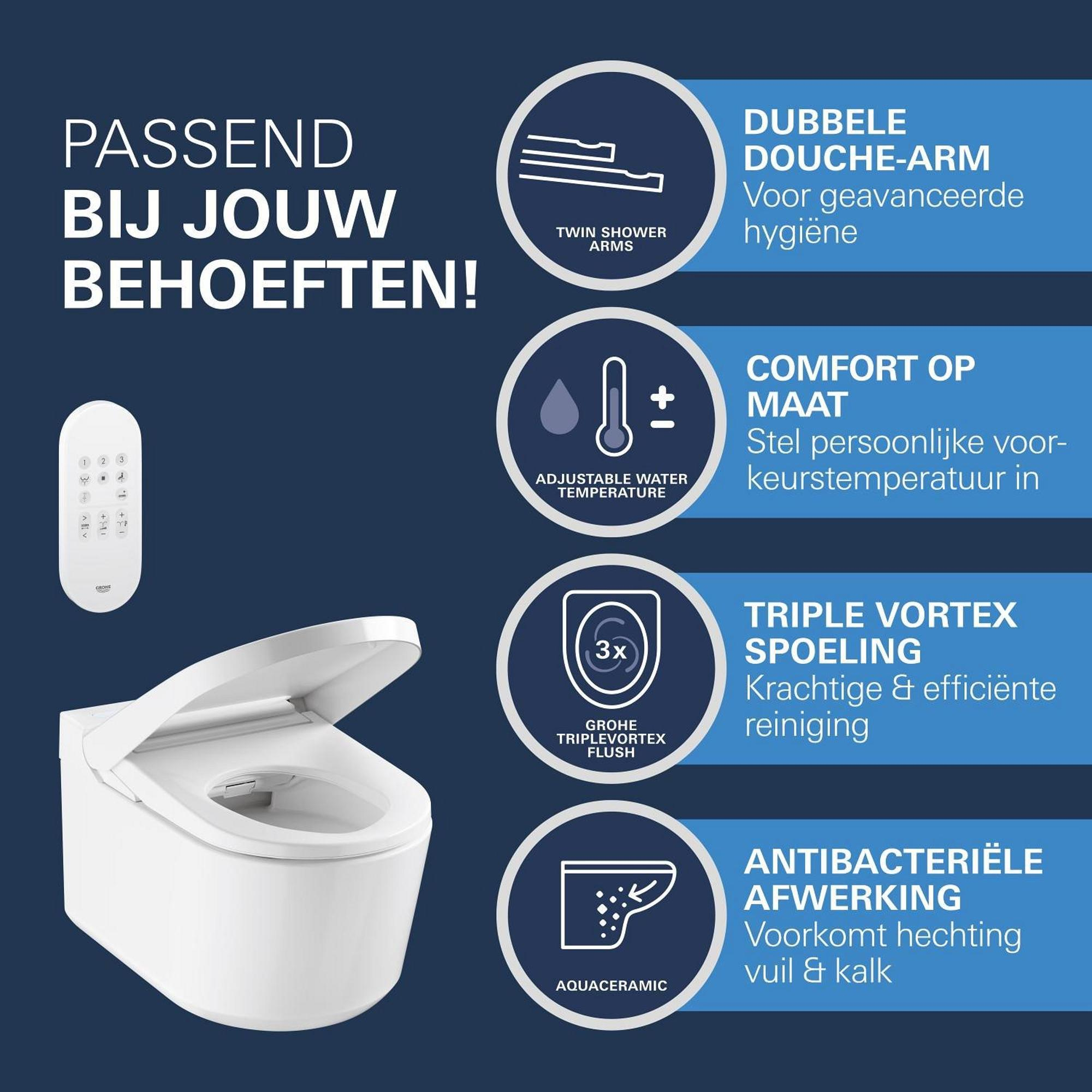 De uitgebreide functies maken dit wandmodel bijzonder gebruiksvriendelijk en comfortabel. Met twee aparte, zelfreinigende douche-armen, waaronder een speciale Lady Shower, pas je de waterstraal aan in positie, intensiteit en temperatuur. De oscillerende en masserende straalsoorten zorgen voor een optimale reiniging en een verkwikkend gevoel. Dankzij de krachtige GROHE Triple Vortex spoeling wordt de hele toiletpot grondig gereinigd zonder dat bacteriën zich kunnen nestelen. Bedien het geheel eenvoudig met de meegeleverde afstandsbediening en profiteer van extra’s zoals een ontkalkingsprogramma en een geïntegreerde waterverwarmer voor onbeperkt warm water.Kenmerken: