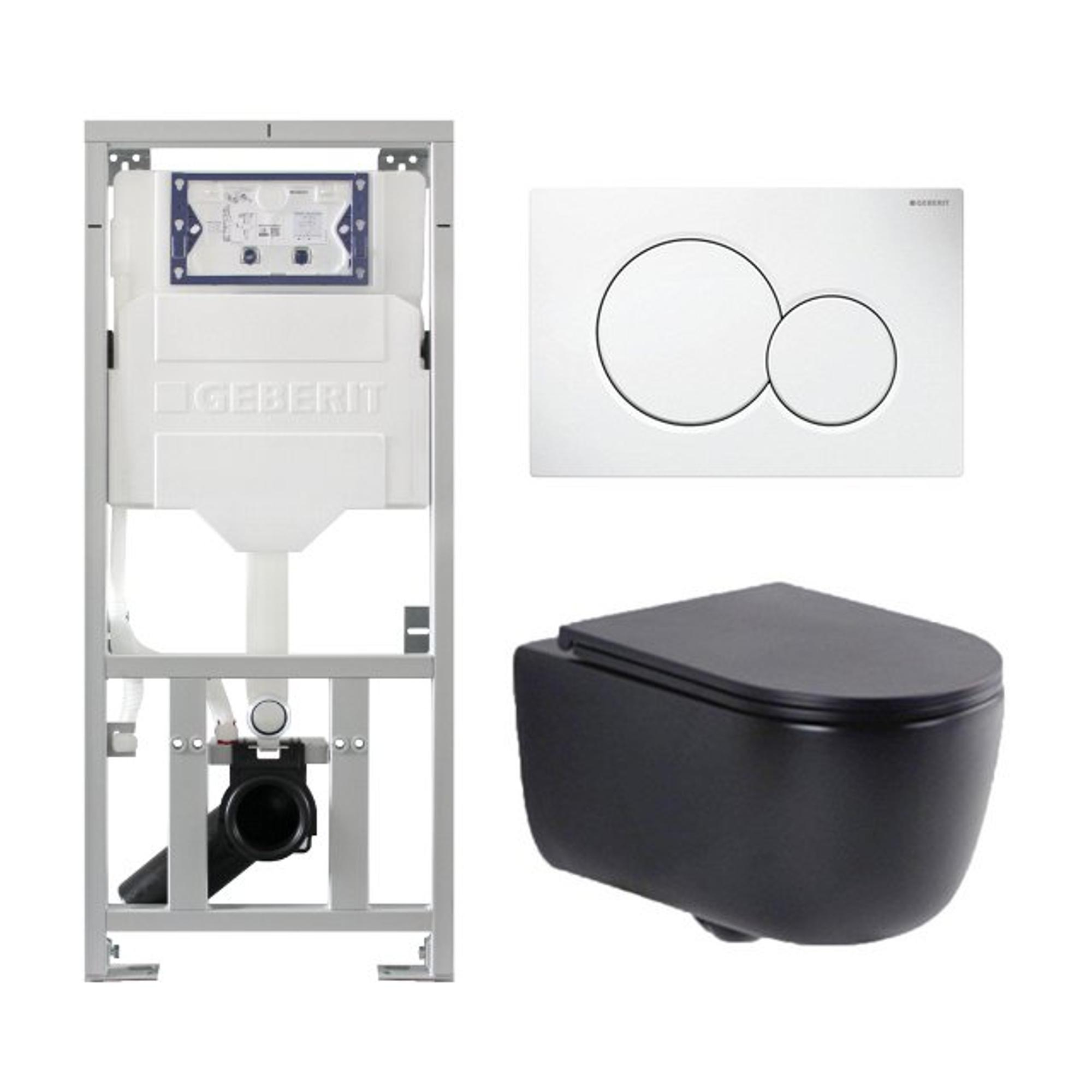 QeramiQ Dely Swirl Toiletset - 36.5x53cm - Geberit UP320 inbouwreservoir - met Burda frame - slim zitting - witte sigma bedieningsplaat - ronde knoppen - mat zwart